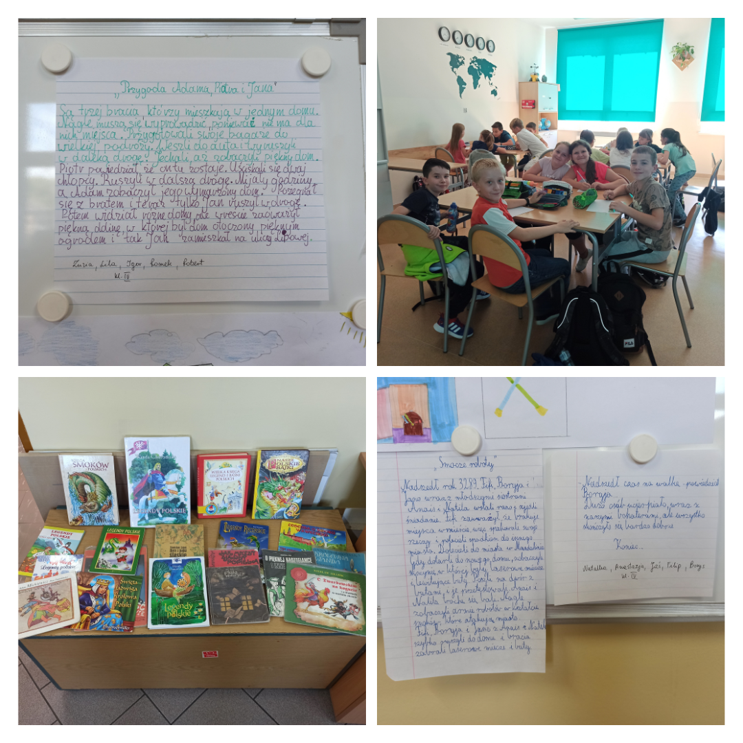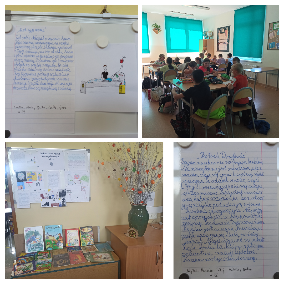 Czwartoklasiści w grupach wymyślali współczesne wersje legend oraz tworzyli do nich rysunki. Pomysłów było sporo. Prace zostały zaprezentowane na gazetce w szkolnej bibliotece wraz z wystawką książek.