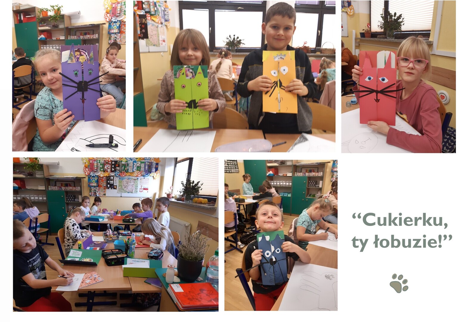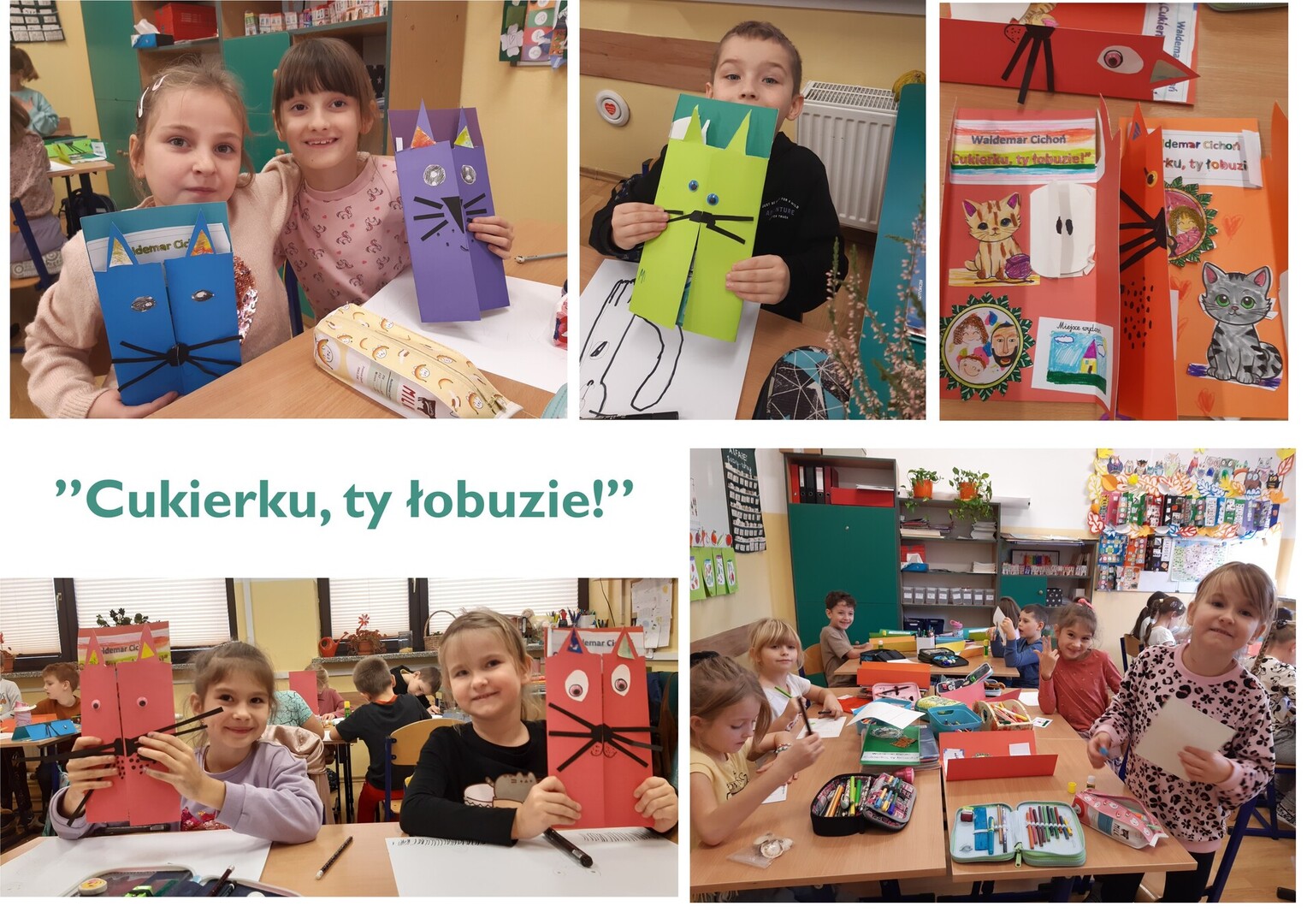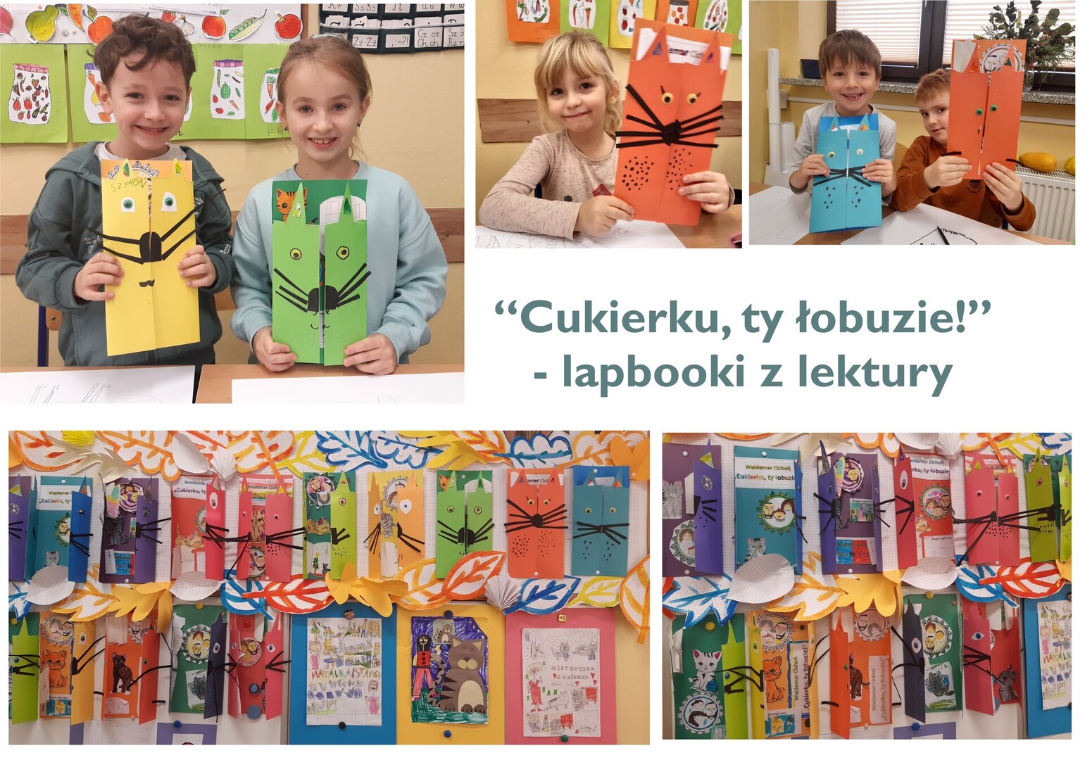 Uczniowie klasy pierwszej zaprzyjaźnili się z Cukierkiem, bohaterem lektury Waldemara Cichonia "Cukierku, ty łobuzie!". Książka zainspirowała nas do wykonania kolejnego lapbooka, w którym znalazły się min. informacje o Cukierku - sympatycznym kocie rozrabiace, jego rodzinie czy miejscu wydarzeń. Czyli.... lektury mają moc!!!