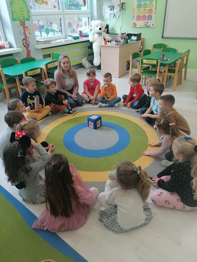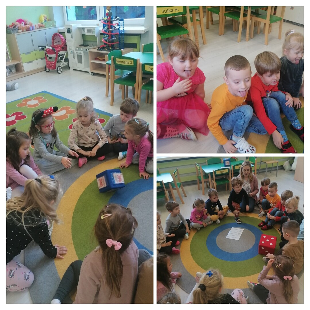 Na piątkowych zajęciach w ramach Ogólnopolskiego Projektu Edukacyjnego „Alfabet Logopedyczny”, Wiewiórki usprawniały motorykę narządów artykulacyjnych. W trakcie zadania „K jak Kostka” dzieci kolejno rzucały kostką i wspólnie wykonywały wylosowane ćwiczenia artykulacyjne.