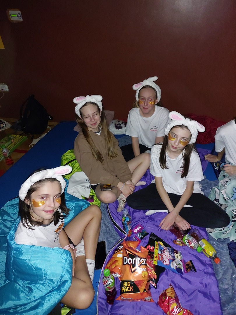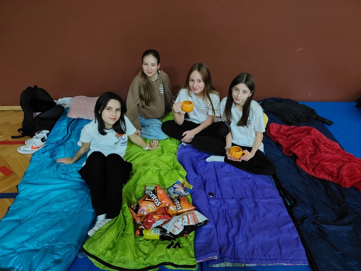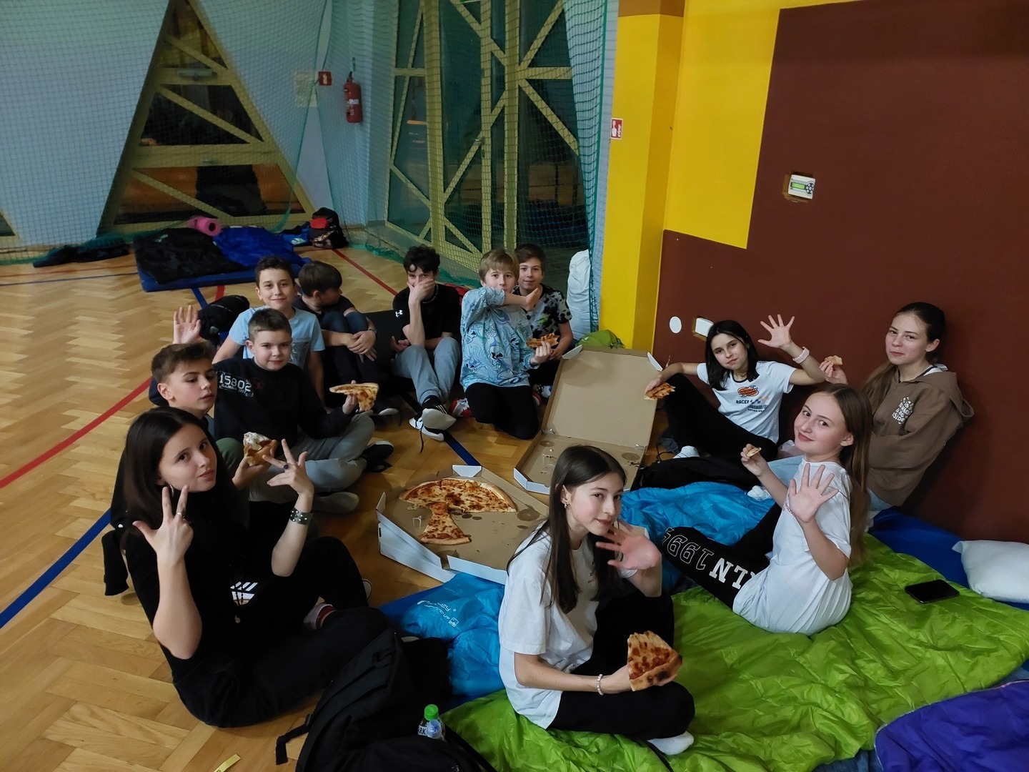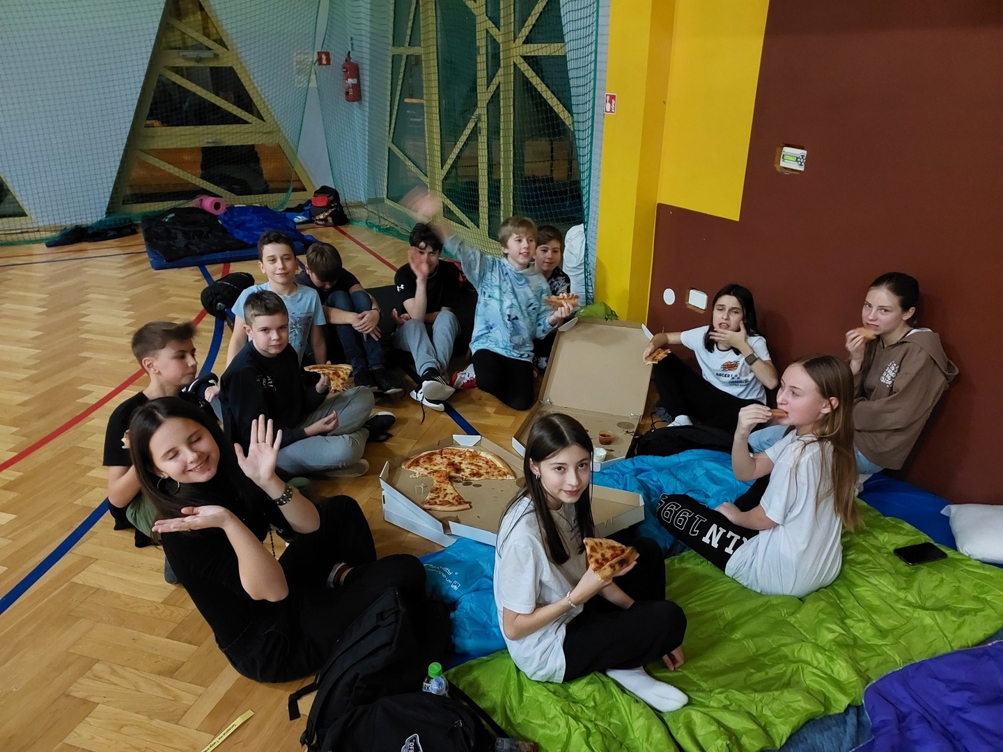 Klasy: piąta, szósta oraz siódma, pod opieką swoich wychowawców, nocowały w szkole z 24 na 25 listopada. To była dobra noc! Oglądaliśmy filmy, graliśmy w planszówki, w siatkę , w kosza. Nawet uczniowie z klasy szóstej przygotowali dla pozostałych dzieci andrzejkowe wróżby. Na kolację zamówiliśmy pizzę z zaprzyjaźnionego Green Gardenu. Piliśmy ciepłą herbatę, okryci swoimi śpiworami. Śmiechom i zabawom nie było końca... Dosłownie:). Noc przebiegła spokojnie, w przyjaznej atmosferze spędziliśmy ze sobą naprawdę super czas. Niewyspani ale szczęśliwi uczniowie rozeszli się rano w sobotę do swoich domów, a o poranku przywitał nas śnieg.