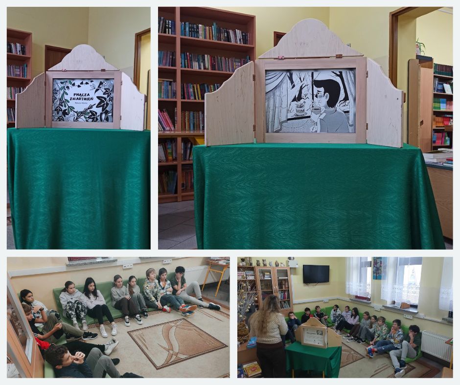Biblioteka szkolna gościła w tym tygodniu uczniów klasy V, VI i VII. Mieli oni okazję obejrzeć wyjątkowe, komiksowe ilustracje i wysłuchać opowieści pt. „Pnącza zmartwień” autorstwa Roksany Wamke w formie teatrzyku kamishibai. To historia o smutku w młodym wieku. Jak przychodzi i rozgaszcza się w nas oraz o tym jak można go uleczyć.