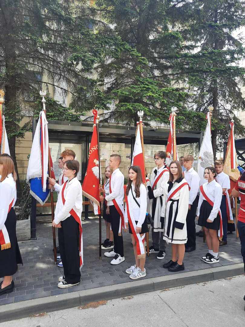 Tradycyjnie reprezentacja naszej szkoły-Pan Dyrektor Mariusz Ruła, opiekun Samorządu Szkolnego-Pani Agnieszka Jusińska i przedstawiciele Samorządu-uczniowie klasy VII brali udział w uroczystościach i złożyli kwiaty pod tablic.