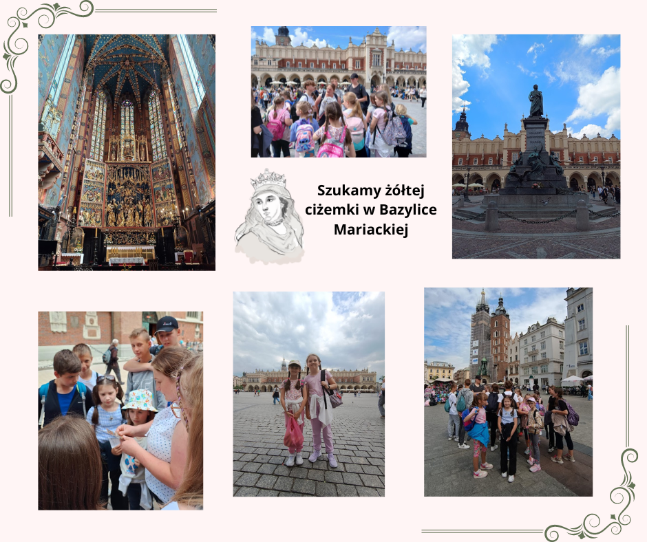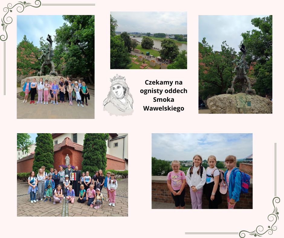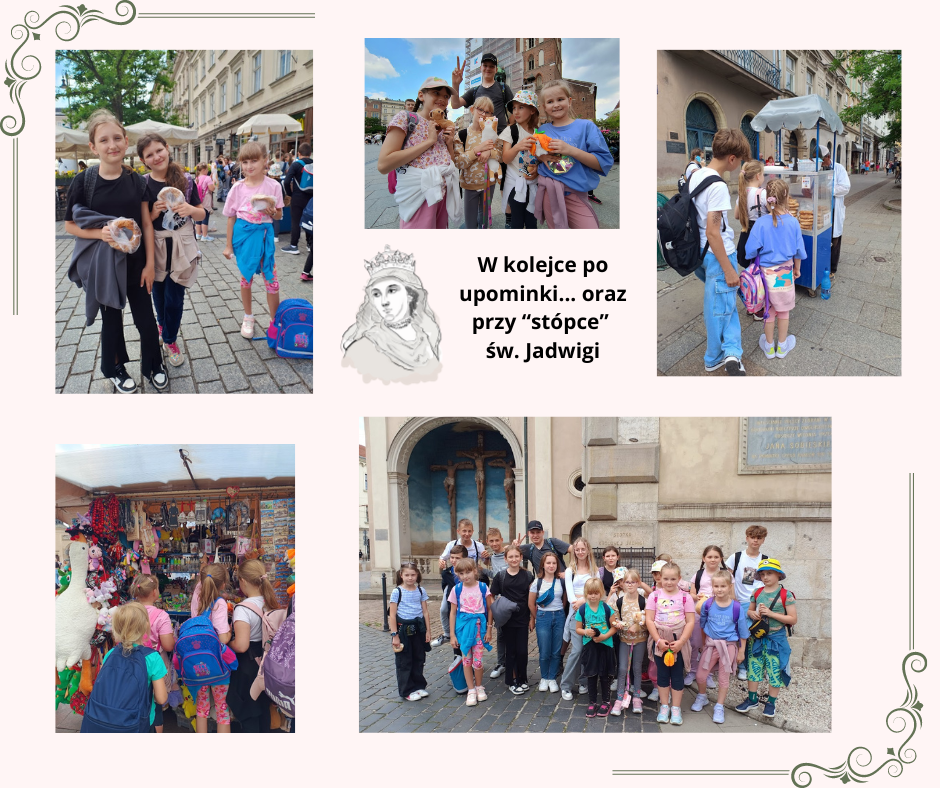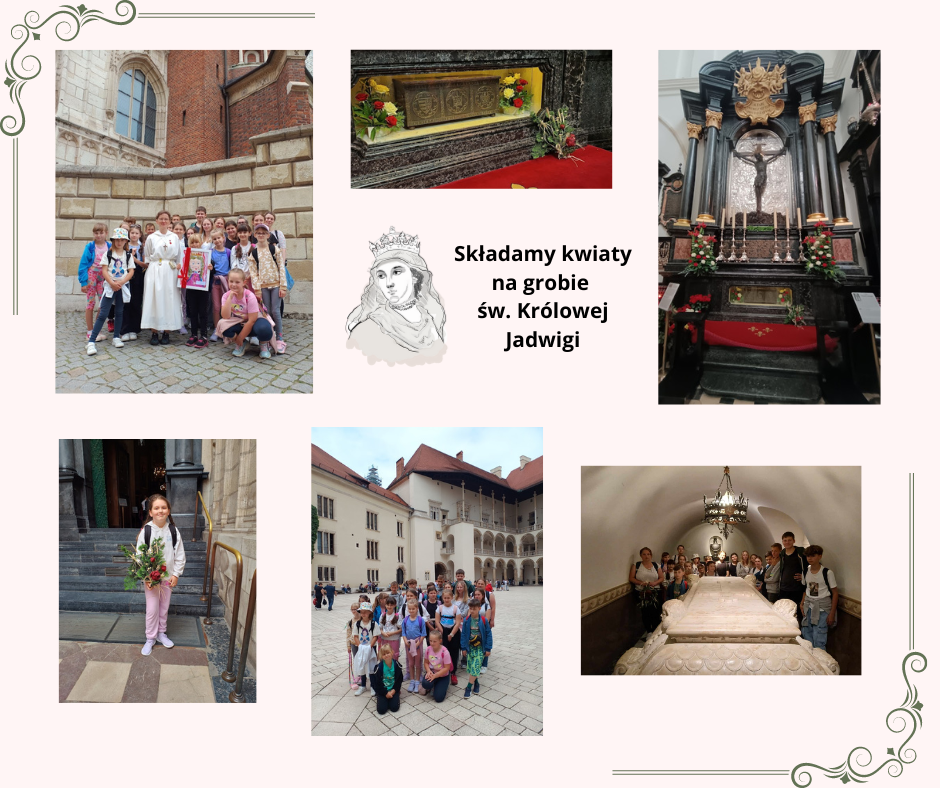 We wtorek 11 czerwca laureaci konkursu plastycznego oraz quizu o życiu naszej patronki udali się na wycieczkę do Krakowa, podczas której odwiedzili miejsca związane ze św. Królową Jadwigą. Zaczęliśmy od zwiedzenia Katedry Wawelskiej, po której oprowadziła nas siostra z zakonu Jadwiżanek Wawelskich. W tym roku obchodzimy 650-lecie urodzin naszej patronki i z tej okazji złożyliśmy kwiaty na jej grobie. Potem udaliśmy się na spotkanie z groźnym Smokiem Wawelskim 😊 Odwiedziliśmy również ks. Roberta Młynarczyka w Seminarium Duchownym. Po krótkiej przerwie na obiad dotarliśmy na Rynek i podziwialiśmy piękny, zabytkowy ołtarz Wita Stwosza w Bazylice Mariackiej, słuchając historii o zgubionej, żółtej ciżemce. Nie zabrakło czasu na zakup upominków i tradycyjnych obwarzanków. Na koniec zrobiliśmy sobie pamiątkowe zdjęcie przy odcisku stópki królowej przy kościele karmelitów, a w drodze do autokaru wstąpiliśmy do uroczego Parku im. Wisławy Szymborskiej. Pogada dopisała, a my zmęczeni, ale zadowoleni wróciliśmy do domów.