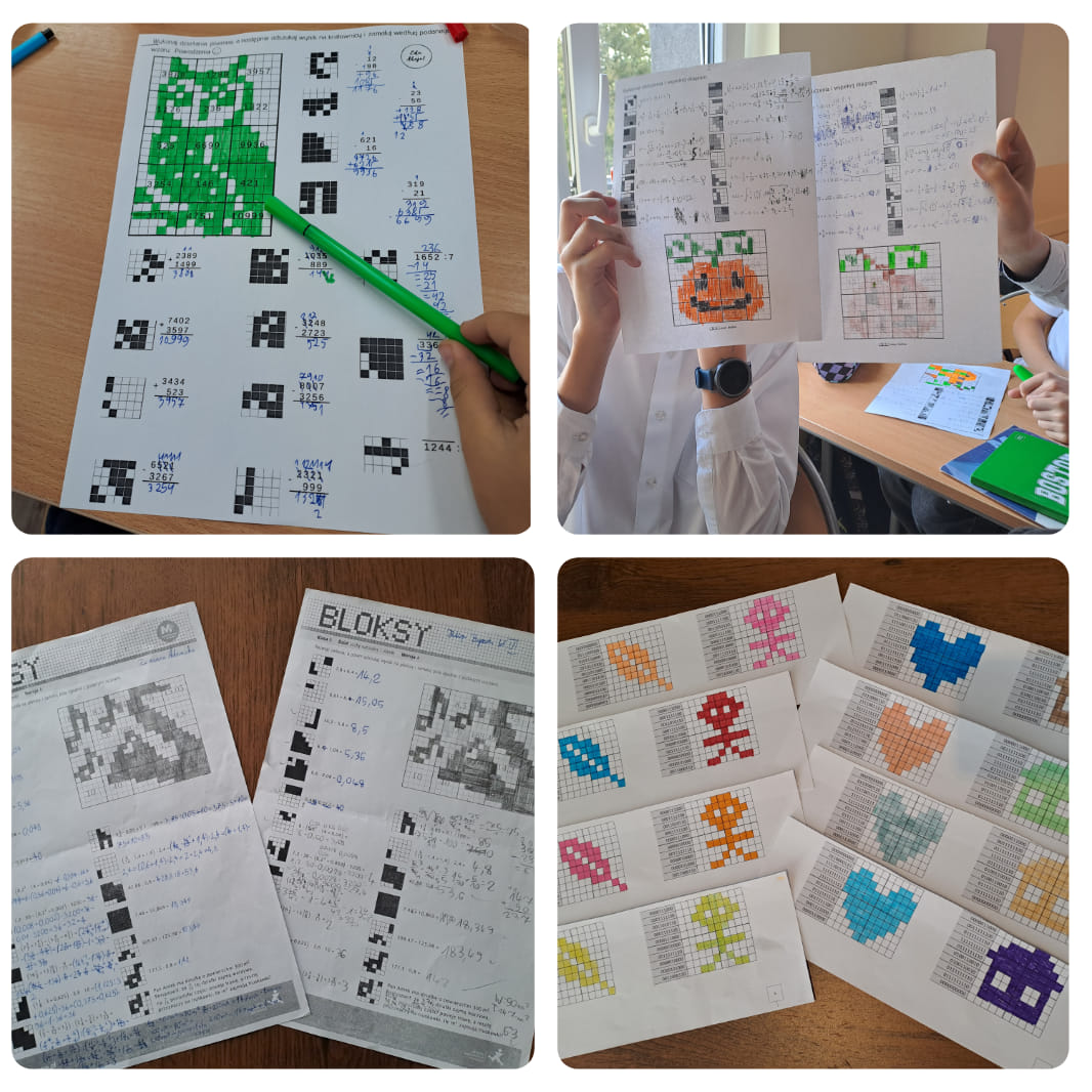 Kodowaliśmy swoje imię wykorzystując kod binarny, szyfrowaliamy zero-jedynkowo, kolorowalismy diagramy wg. instrukcji ćwicząc tabliczkę mnożenia, działania na ulamkach zwykłych i dziesietnych, potęgując i pierwiastkując. Zamienialiśmy jednostki długości, masy i czasu. Ogromną radość sprawiło nam wykonywanie działań matematycznych, zakończone odkrywaniem przeróżnych mozaik na aplikacji