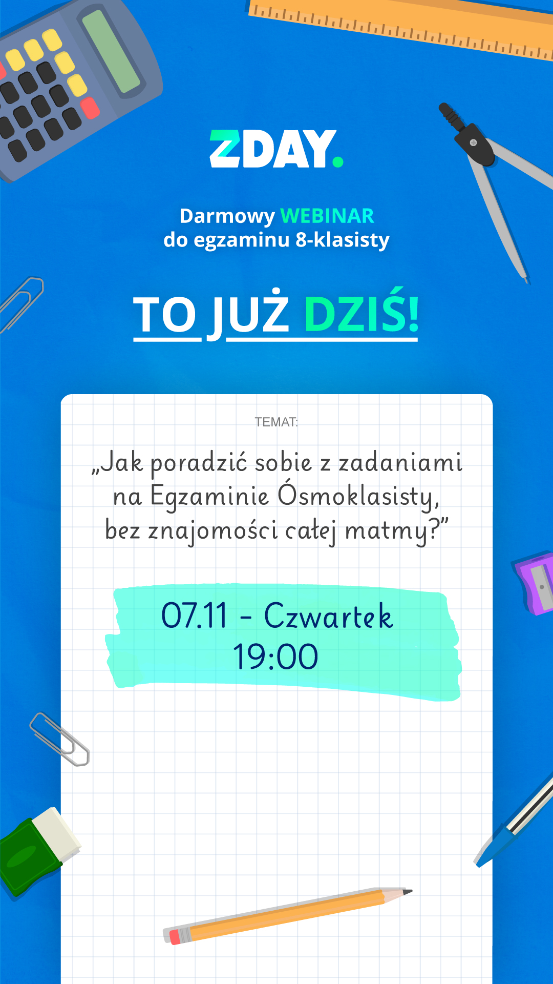 Już 07 listopada 2024 r. o godz. 19:00 startujemy z pierwszym webinarem z cyklu, po ogromnym sukcesie w zeszłym roku. Webinar będzie zatytułowany: "Jak poradzić sobie z zadaniami na Egzaminie Ósmoklasisty, bez znajomości całej matmy?"