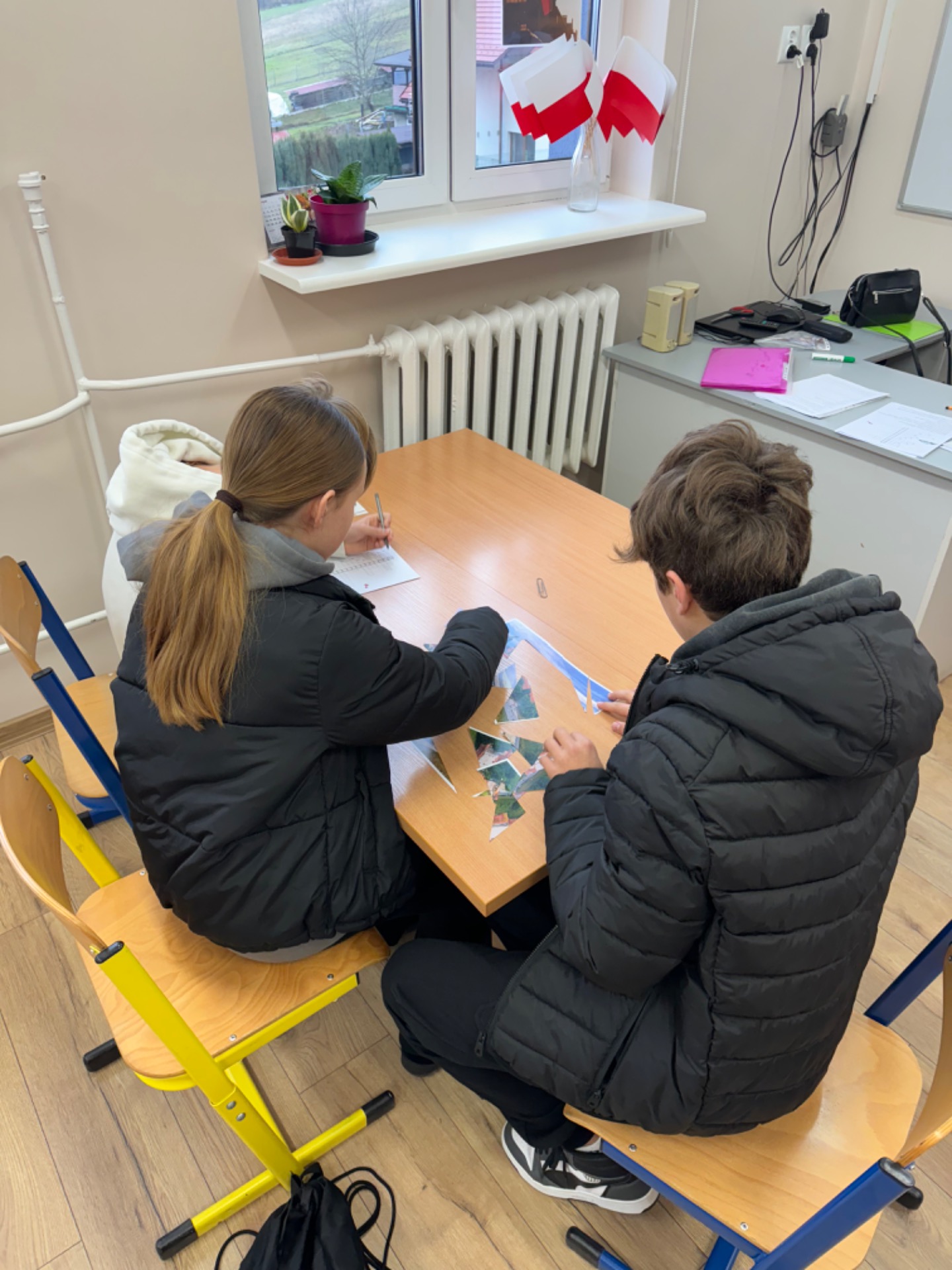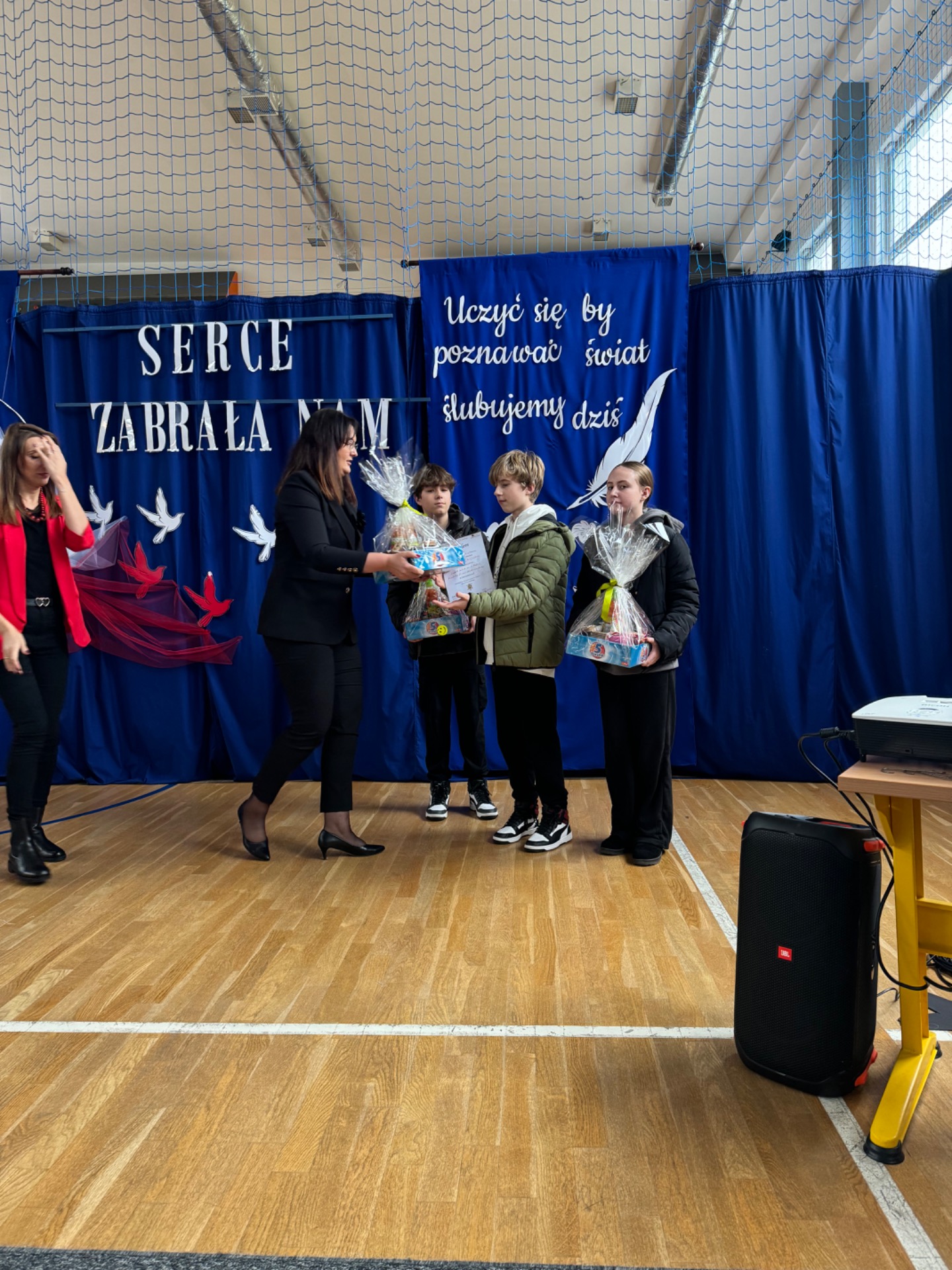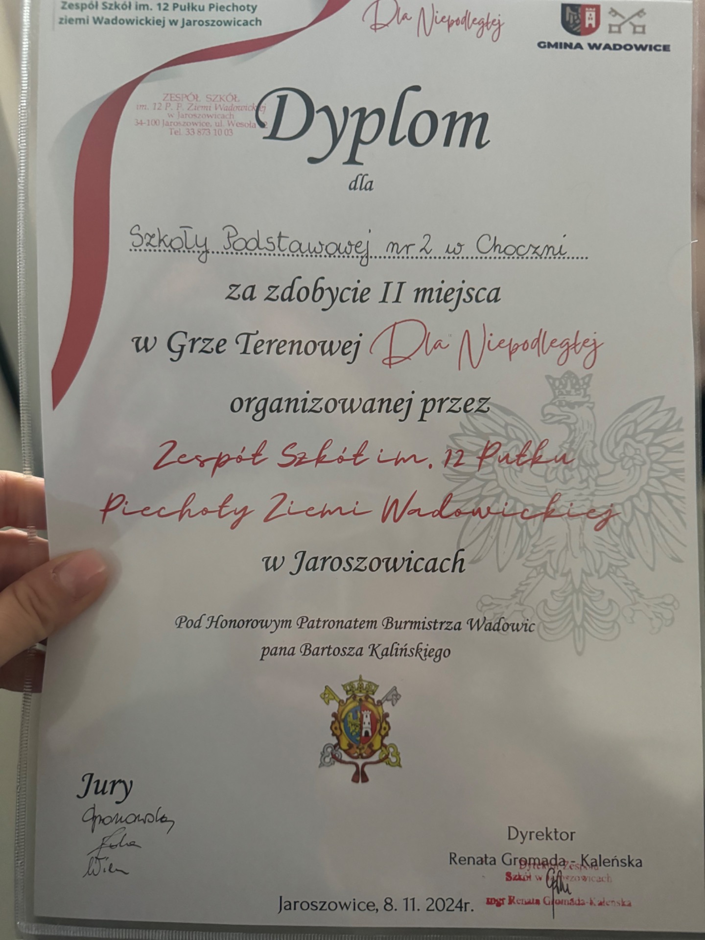 Brawo! Brawo! Brawo! Nasi wspaniali z 7 klasy w składzie Maja Dziedzic, Jan Książek i Ludwik Książek zdobyli dzisiaj 2 miejsce w grze terenowej „Dla Niepodległej” zorganizowanej przez Zespół Szkół im. 12 Pułku Piechoty Ziemi Wadowickiej w Jaroszowicach pod honorowym patronatem Burmistrza Wadowic. Musieli wykazać się dużą wiedzą oraz sprytem aby rozwiązać wszystkie zadania przygotowane na poszczególnych stacjach, do których podążali za pomocą mapy. Dziękujemy bardzo szkole w Jaroszowicach, Pani Dyrektor oraz wszystkim tamtejszym koordynatorom gry za tak miłe zaopiekowanie się na nami; za pyszny obiad, wszystkie słodkości oraz nagrody.