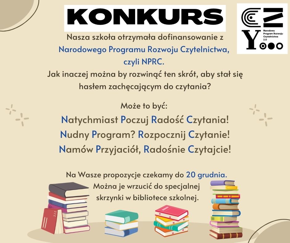 Nasza szkoła otrzymała dofinansowanie z Narodowego Programu Rozwoju Czytelnictwa, czyli NPRC. Jak inaczej można by rozwinąc ten skrót, aby stał się hasłem zachęcającym do czytania?