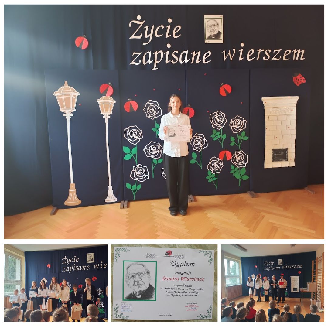 Sandra Wiercimak została laureatką I Gminnego Konkursu Recytatorskiego Poezji Ks. Jana Twardowskiego organizowanego przez Szkołę Podstawową w Babicy pt.: "Życie zapisane wierszem". We wtorek uczennica wzięła udział w uroczystym rozdaniu nagród. Sandra zaprezentować swoje recytacje wierszy przed zgromadzoną publicznością. Serdecznie gratulujemy!