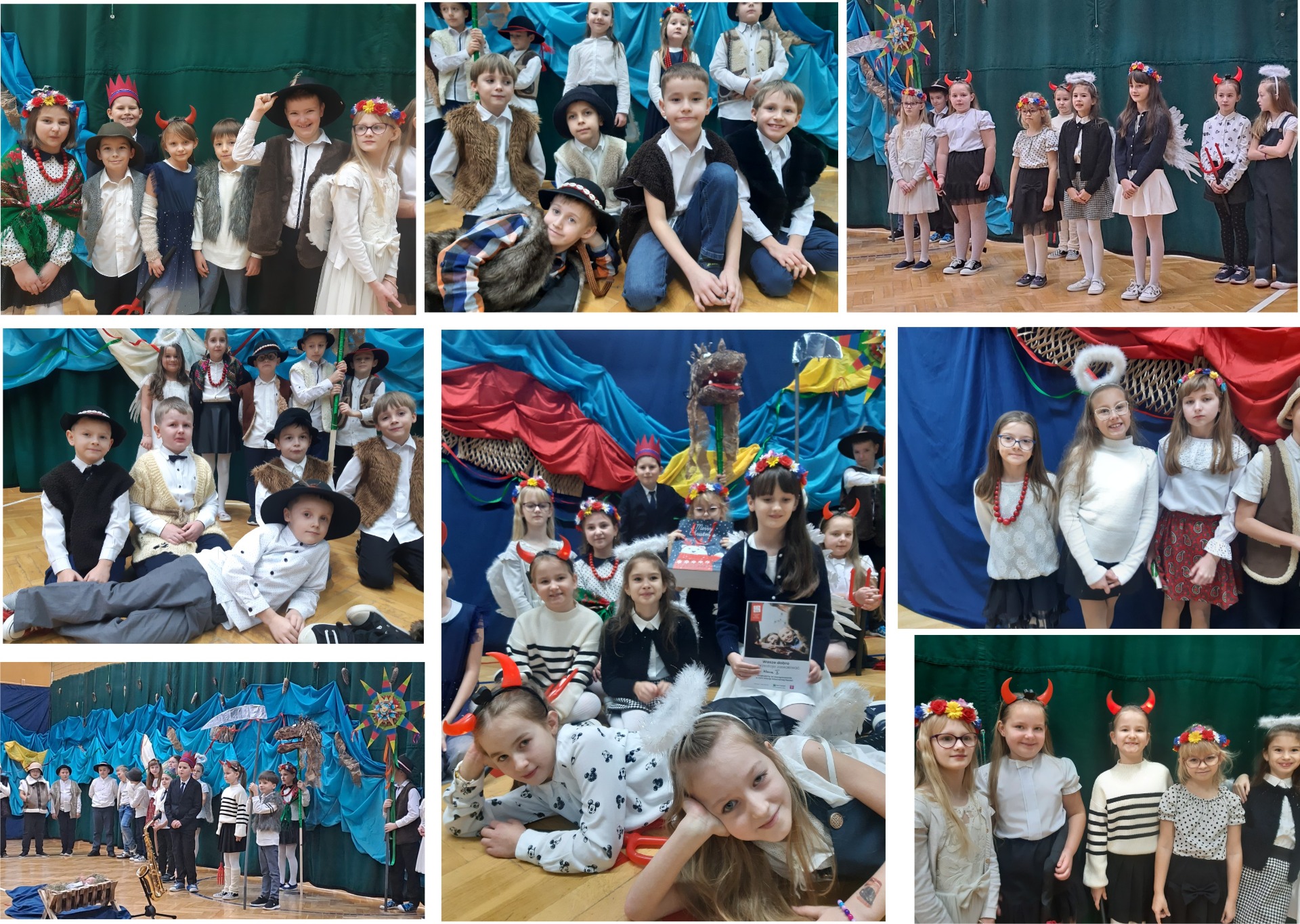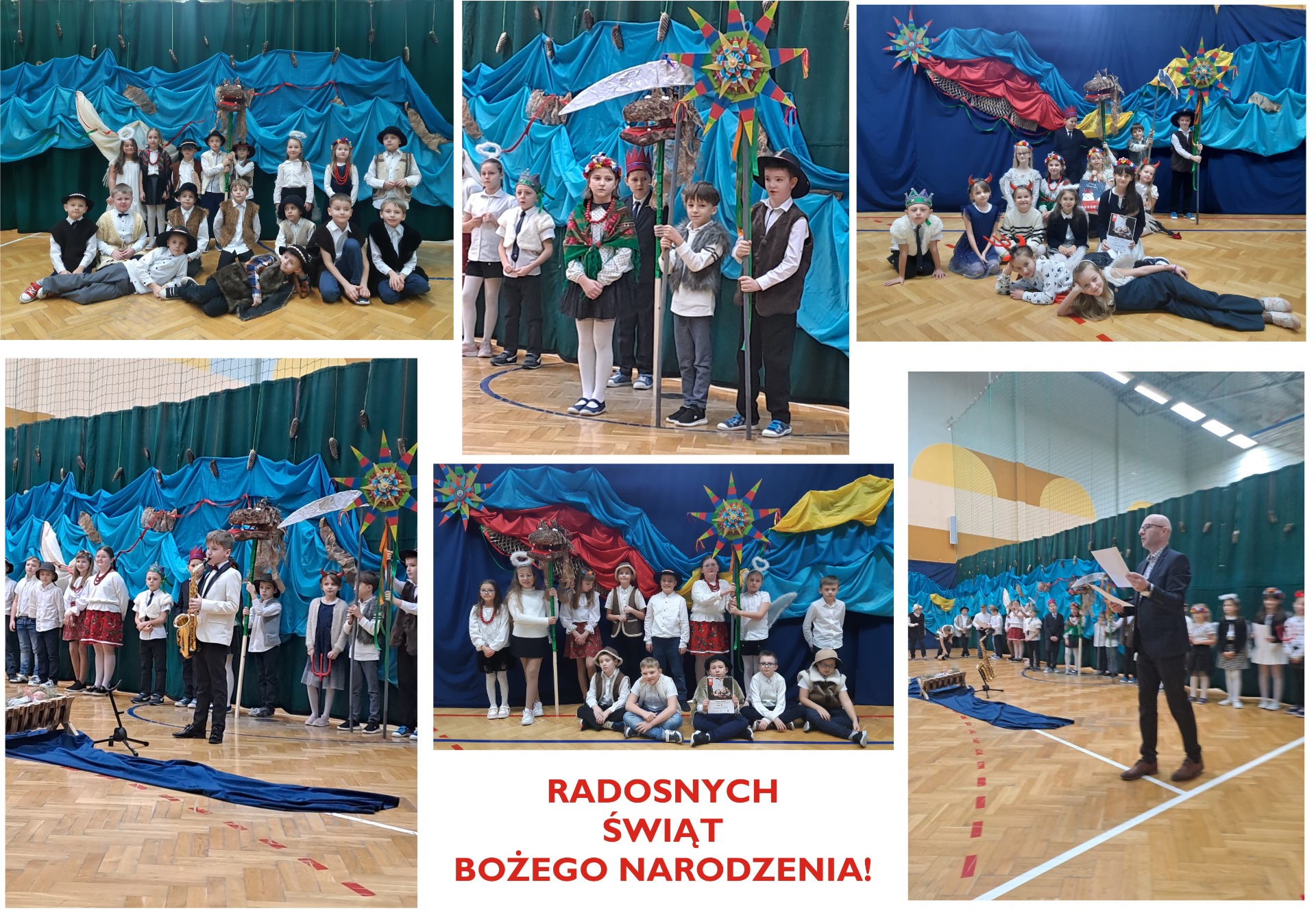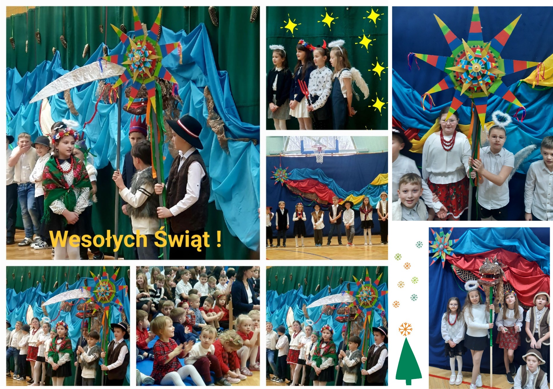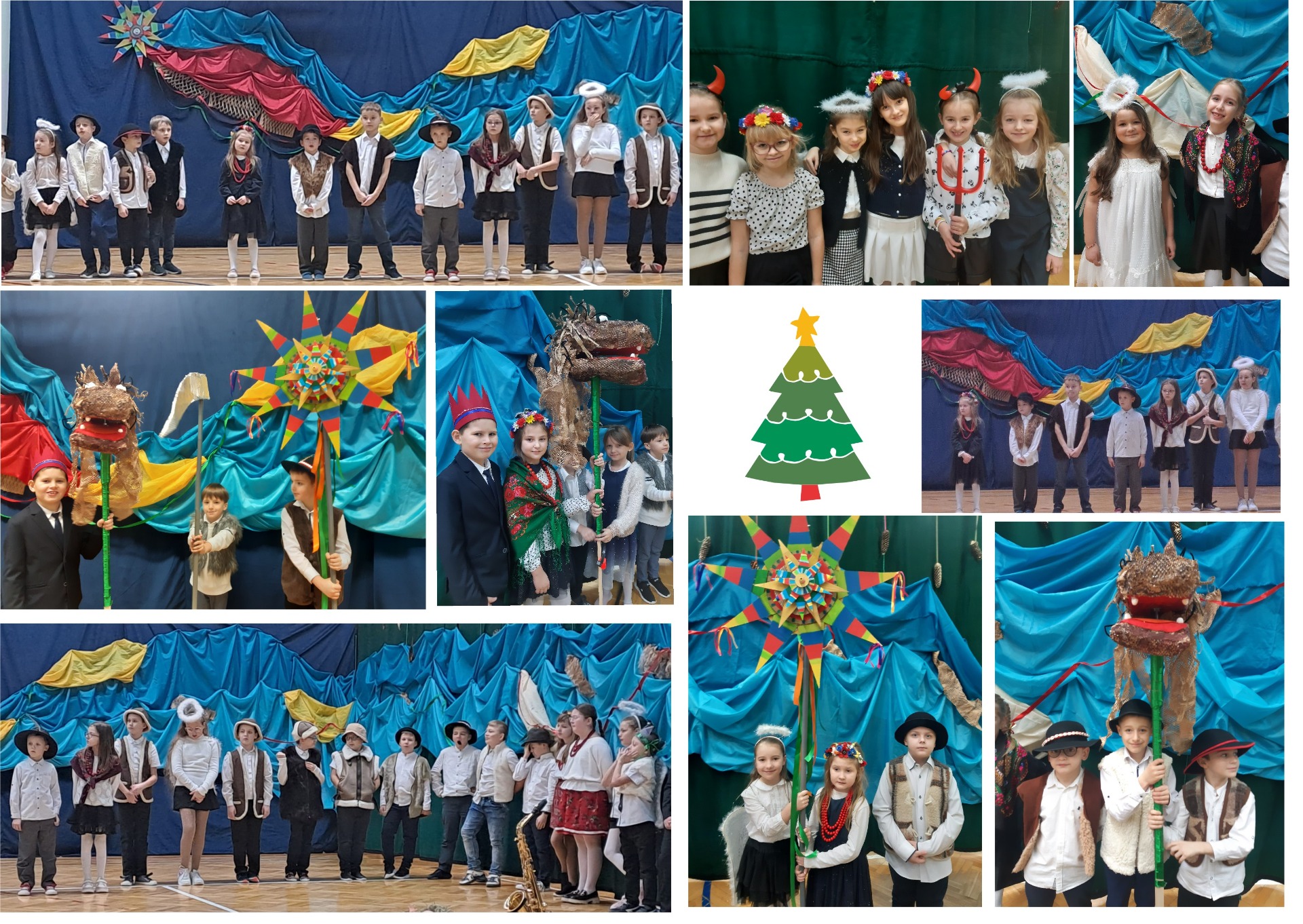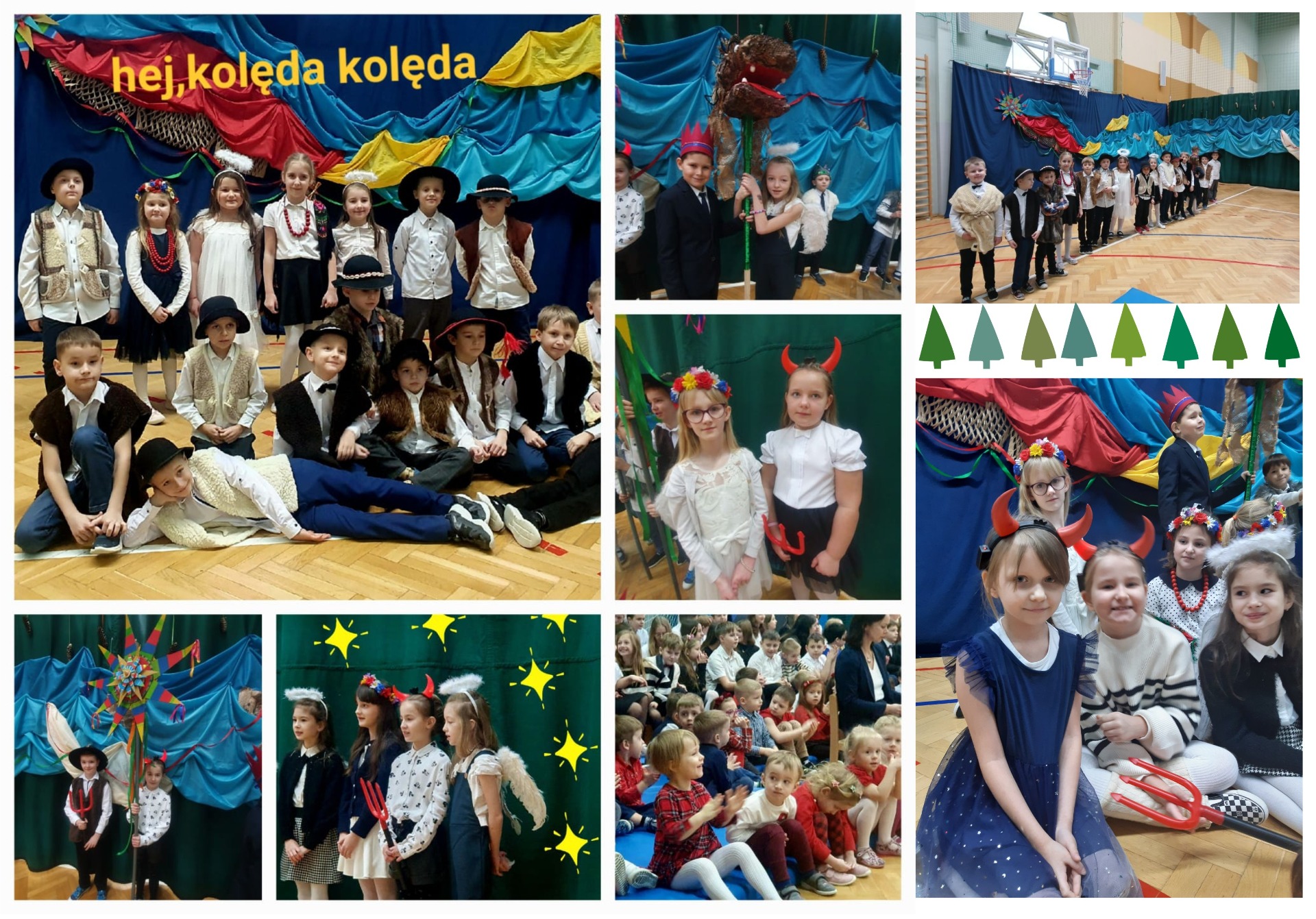 W świąteczny nastrój wprowadziły nas kolędy w wykonaniu Wojtka Komana na saksofonie oraz gra Ani Jabłońkiej na keyboardzie. Uczniowie klas 1-3 zaprezentowali swoje umiejętności deklamując wiersze nawiązujące do tradycji i zwyczajów świąt Bożego Narodzenia tj. ubieranie choinki, oczekiwanie na pierwszą gwiazdkę, łamanie opłatkiem, przygotowanie dwunastu potraw wigilijnych czy pozostawienie wolnego miejsca przy stole. Nie zabrakło też elementów staropolskiej tradycji ludowej - odwiedzin i życzeń kolędników z gwiazdorem, turoniem, Herodem, diabłem i aniołem. Całość przeplatana była wspólnym śpiewaniem piosenek, kolęd i pastorałek.