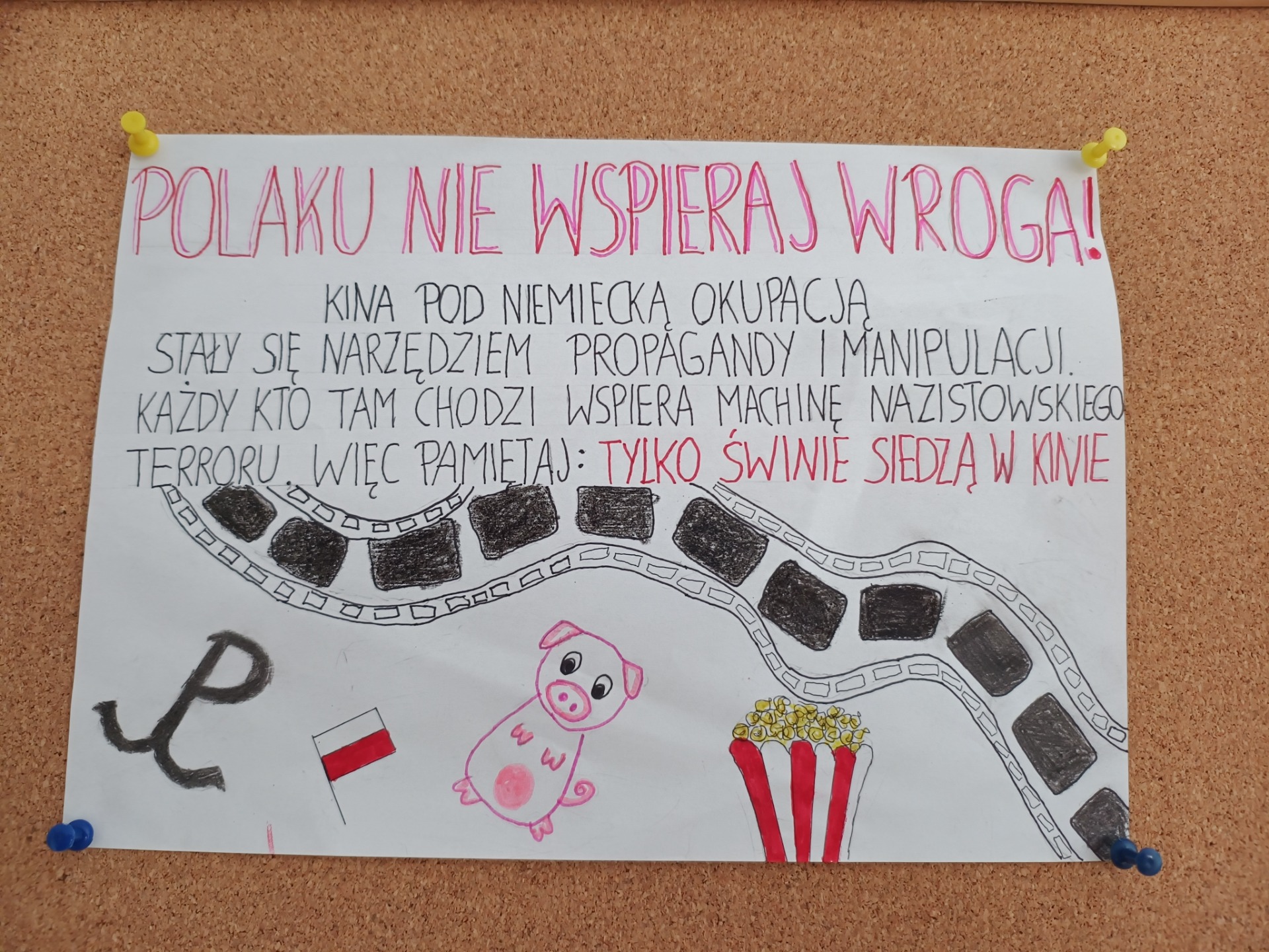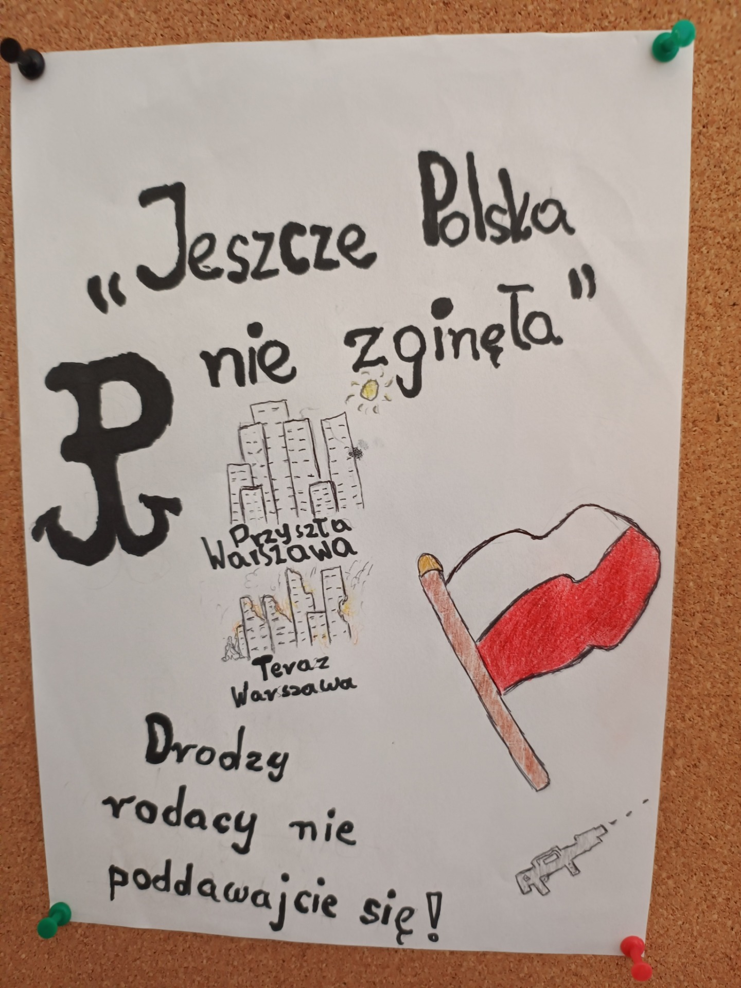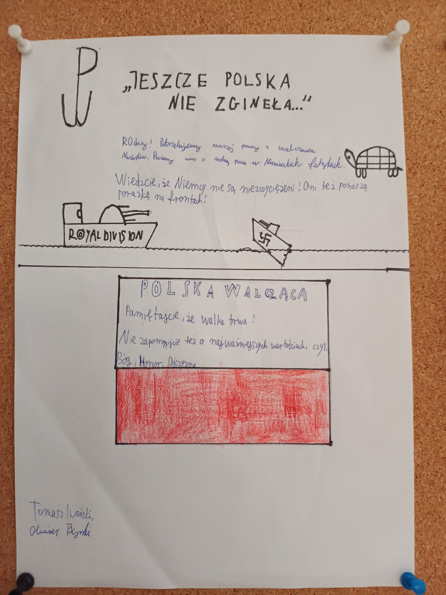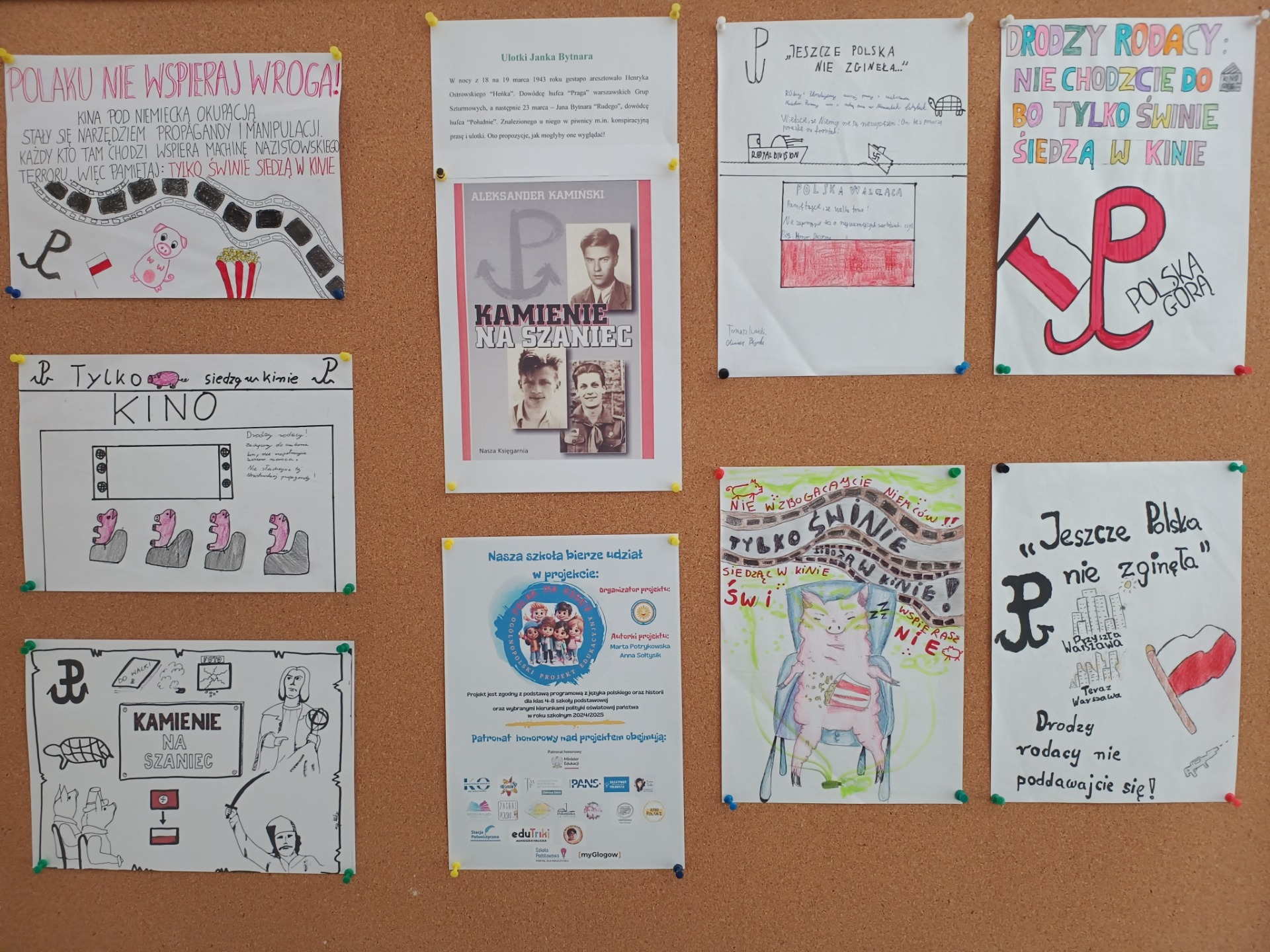 W ramach podsumowania lektury "Kamienie na szaniec" uczniowie klasy VIII wykonali projekty ulotek konspiracyjnych jednego z bohaterów tej książki - Janka Bytnara. Ósmoklasiści świetnie poradzili sobie z zadaniem i stworzyli patriotyczne grafiki.