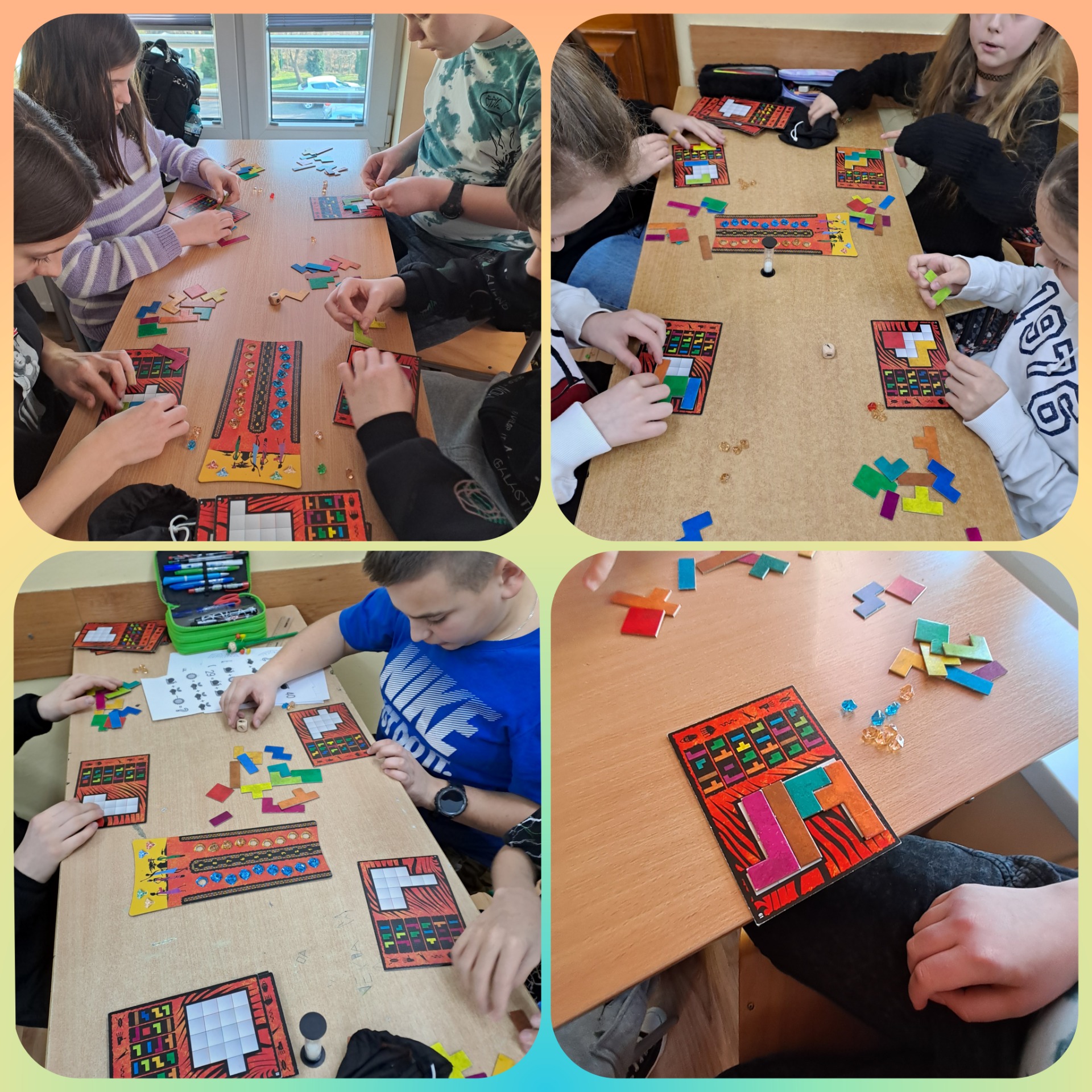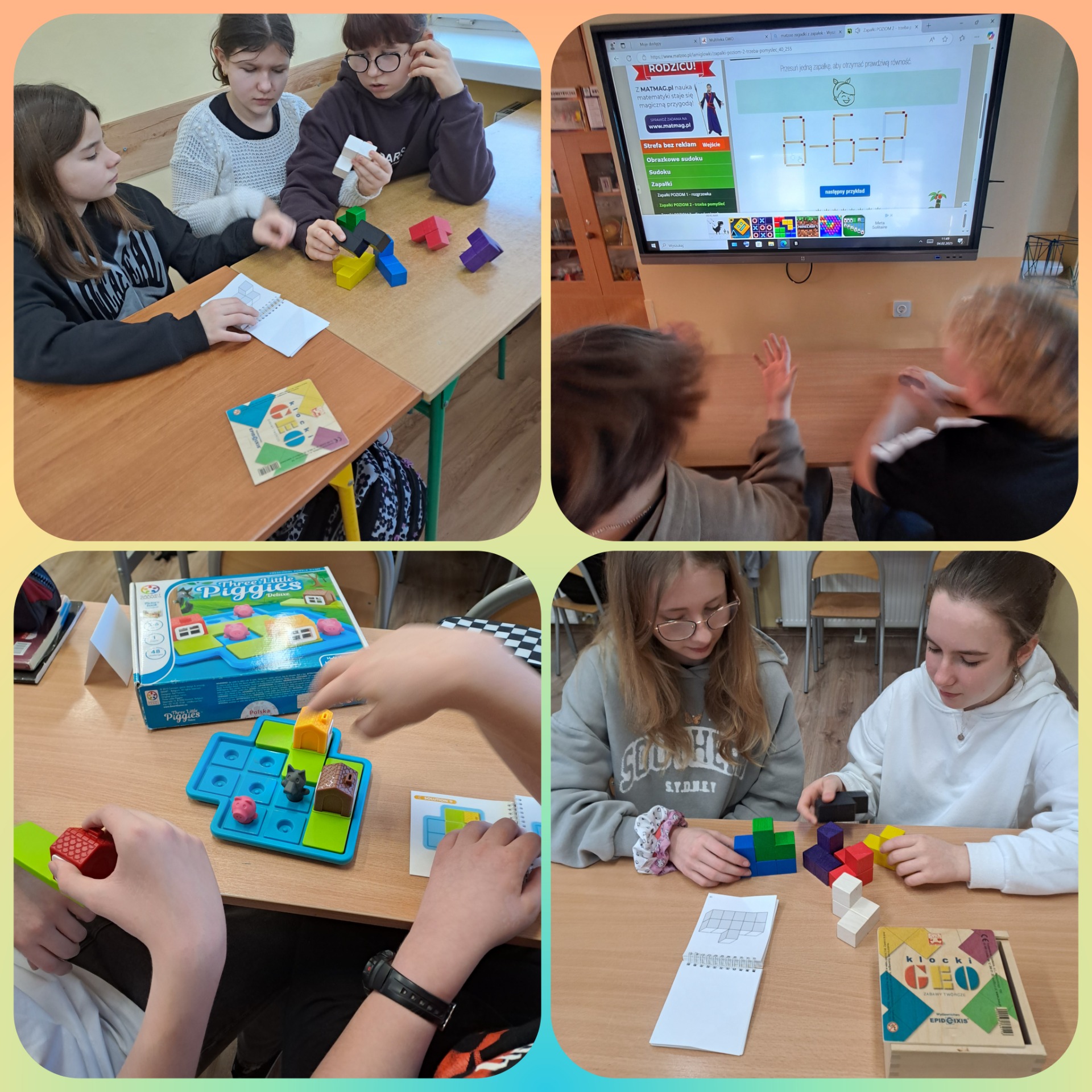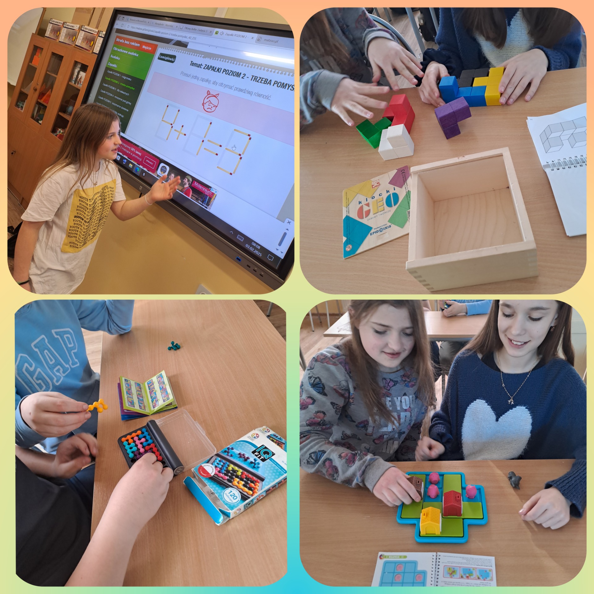 W związku z tym na zajęciach matematyki ćwiczyliśmy w bardzo przyjemny sposób nasze logiczne myślenie. Uczniowie pracowali na lekcjach metodą stacji zadaniowych. Rozwiązywali różnego typu zadania, łamigłówki, zagadki, układanki przestrzenne, grali w gry logiczne. W trakcie umysłowego treningu wykorzystaliśmy: grę Ubongo, Three Little Piggies, GEO klocki, IQ Fit, łamigłówki ZAPAŁKI (Matzoo), labirynty, zagadki liczbowe oraz rysunkowe. Każda stacja zadaniowa cieszyła się ogromnym zainteresowaniem uczniów.
