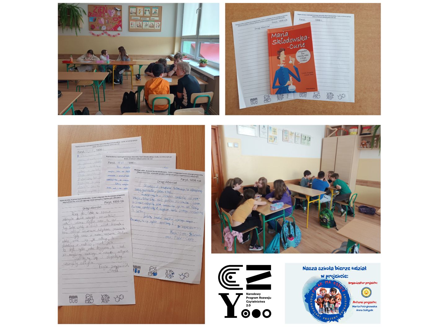 Po zapoznaniu się z fragmentem książki pt. "Nazywam się Maria Curie-Skłodowska" L. Cugoty i L. Very uczniowie klasy 5 wcielili się w wybitną noblistkę. Powstały kartki z pamiętnika przedstawiające dzień z życia naukowczyni oraz pełne emocji listy do Alberta Einsteina. Powrót do przeszłości spodobał się dzieciom i chętnie opisywały radość Marii z odkrycia polonu lub radu.