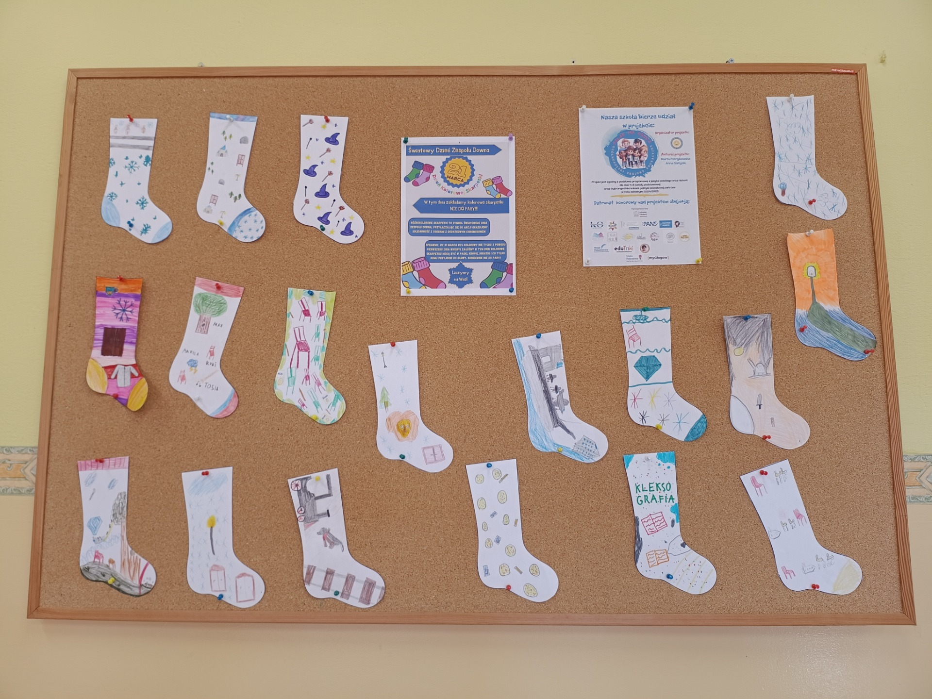 21 marca obchodzimy co roku Światowy Dzień Zespołu Downa, który nazywany jest również dniem kolorowych skarpetek. Założenie ich na swoje stopy jest znakiem solidarności z osobami chorymi. Uczniowie klasy IV z zapałem ozdabiali skarpetki motywami z lektur. Powstała nawet gazetka.