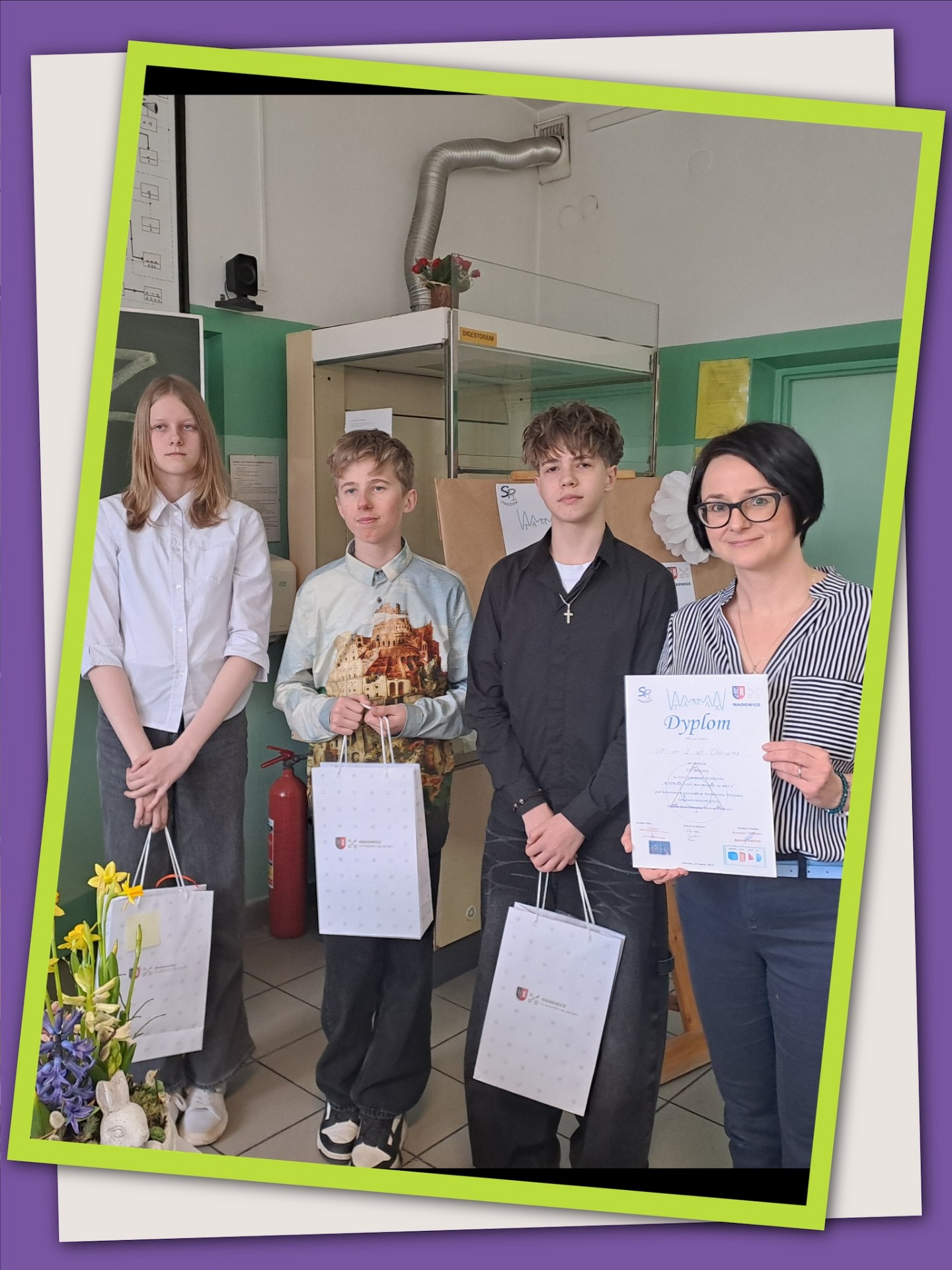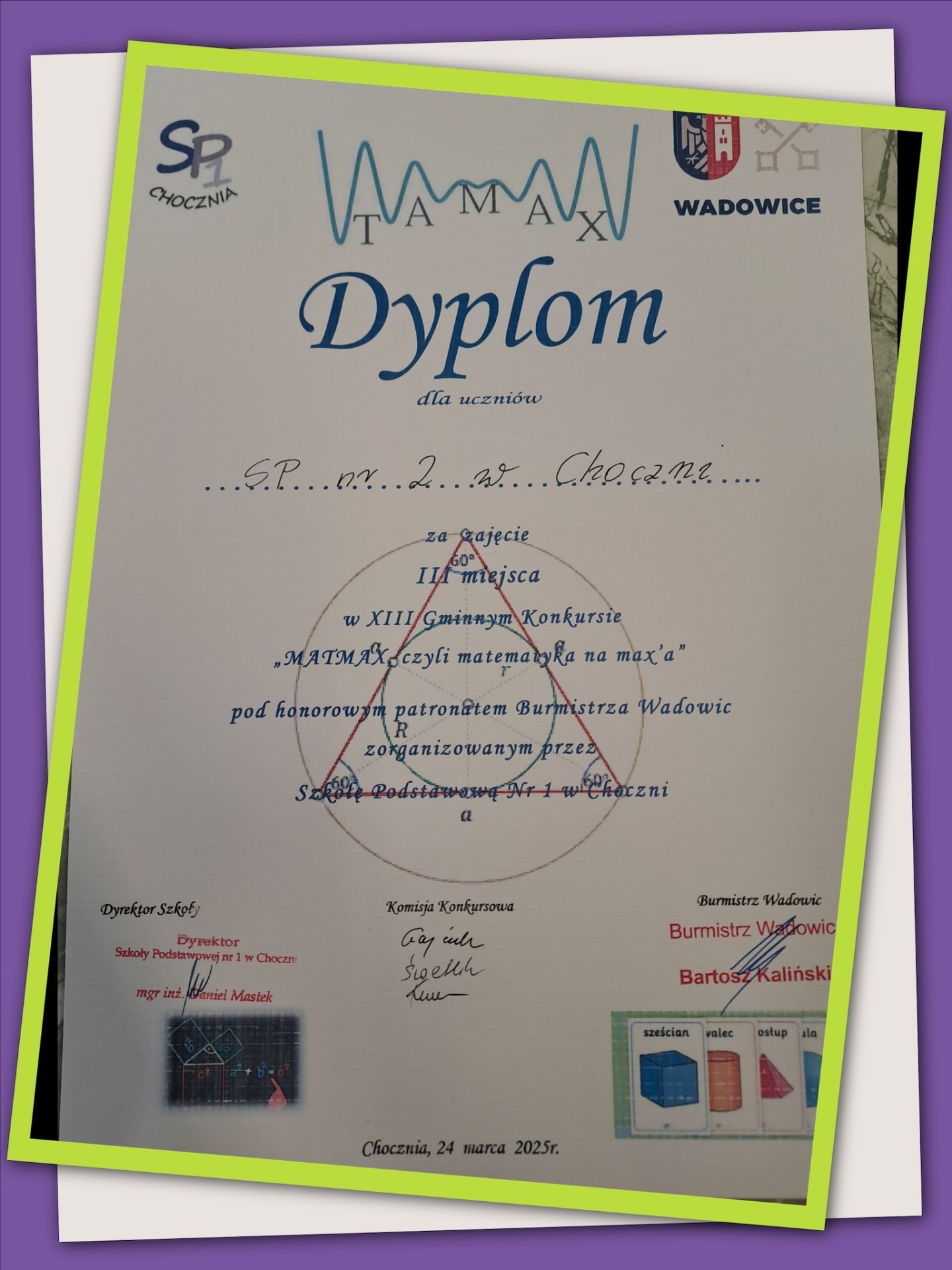 24 marca odbyła się XIII edycja Gminnego Konkursu Matematycznego "Matmax czyli matematyka na max'a" organizowanego przez Szkołę Podstawową nr 1 w Choczni. Naszą szkołę reprezentowali: Ludwik Książek z kl.VII oraz Weronika Guzdek i Bartłomiej Lachendrowicz z kl. VIII. Zmierzyli się z 12 drużynami z naszej gminy i wspólnie stawili czoła 40 zadaniom! Ostatecznie nasza drużyna zajęła III miejsce!!!