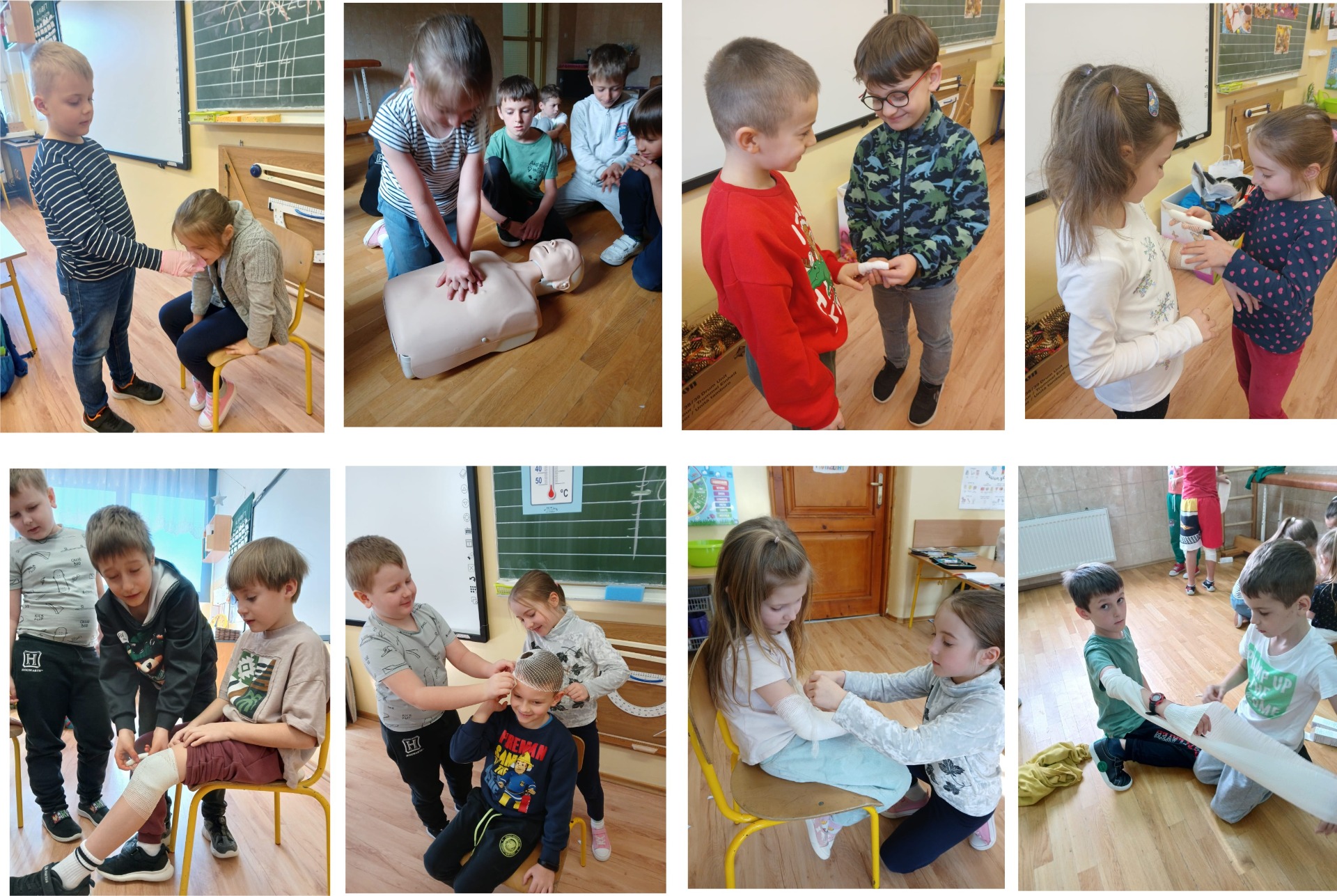 Przez cały rok szkolny uczniowie klasy I uczyli się jak pomagać innym w razie wypadku, skaleczenia, zadławienia, krwotoku. Poznali numery alarmowe. Wiedzą już co powinno znaleźć się w domowej apteczce. Zostali małymi ratownikami!