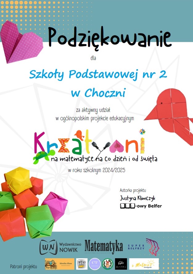 W czerwcu wykonaliśmy ostatnie zadanie matematyczne w ramach projektu "Kreatywni na matematyce na co dzień i od święta" i właśnie otrzymaliśmy certyfikat i podziękowanie za całoroczny udział w tym niezwykle twórczym projekcie.