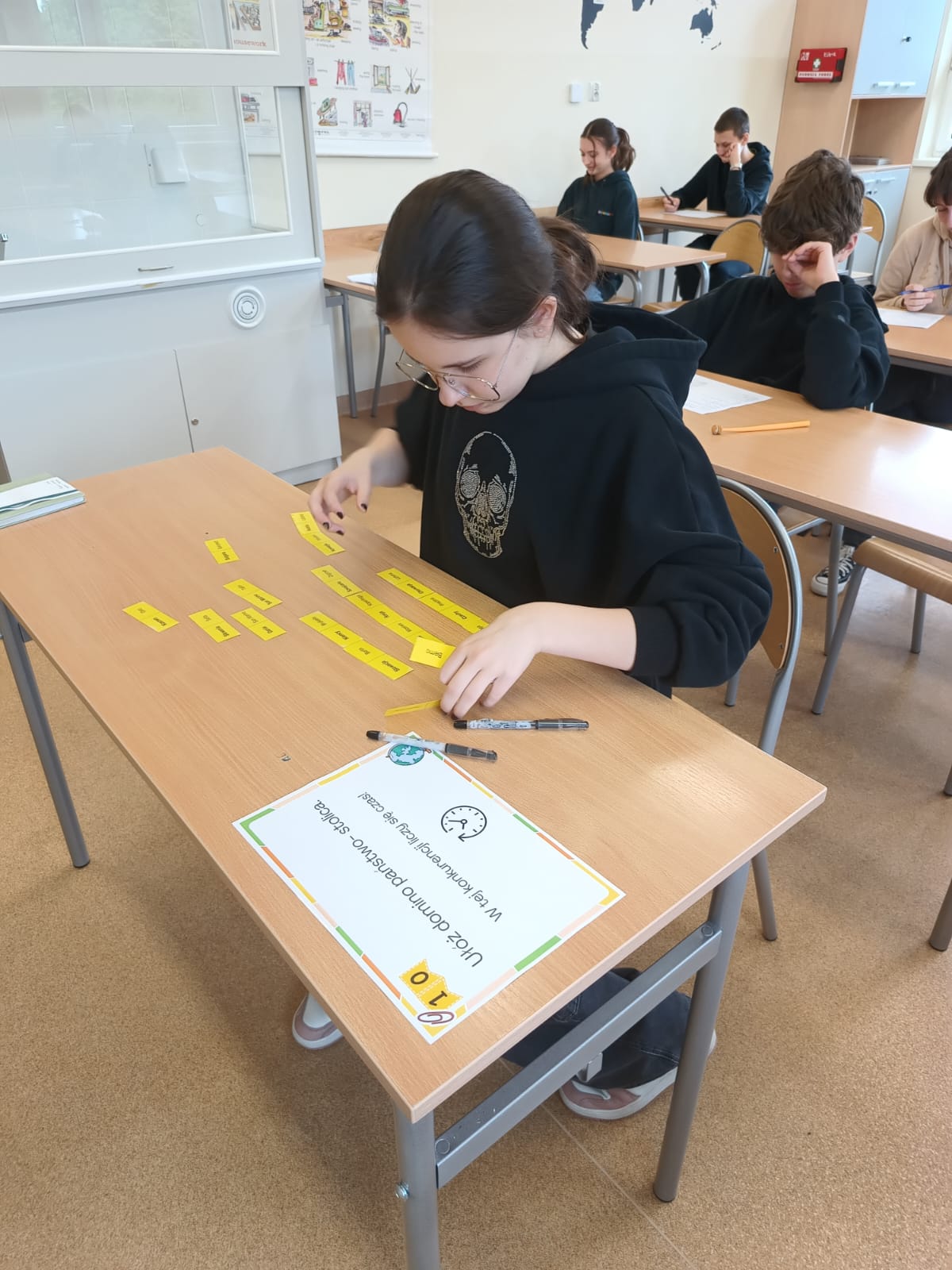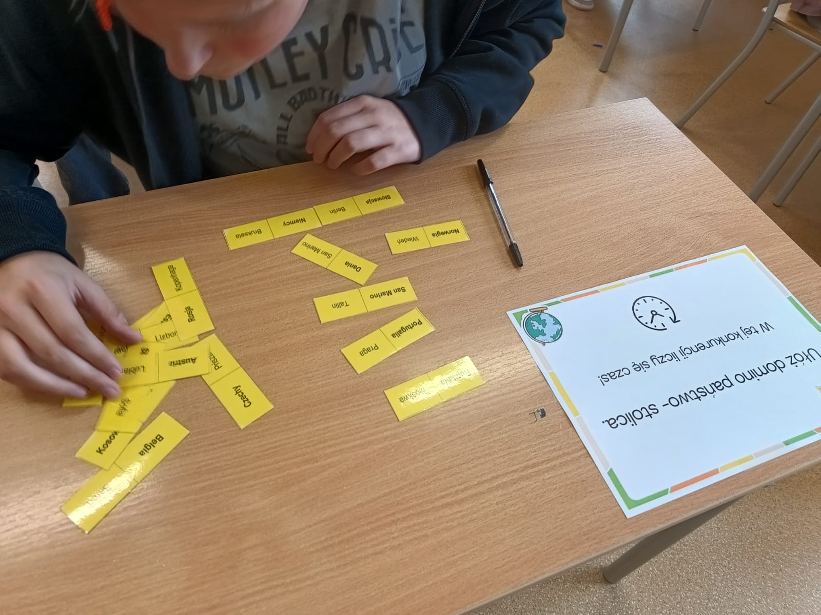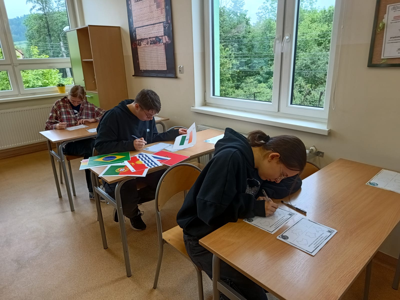 Te i inne geograficzne zagadki rozwiązywali uczestnicy Turnieju Państw Świata, który odbył się w maju w naszej szkole. W Turnieju wzięło udział 11 uczniów klas starszych. Zmierzyli się z pytaniami dotyczącymi państw świata w formie tradycyjnej - testu, a także warsztatowej, podczas której przechodzili kolejno przez pięć stanowisk z zadaniami, w których liczył się również uciekający szybko czas. Nasi ochotnicy dzielnie mijali kolejne stanowiska. I choć w skupieniu rozwiązywali zawiłe zagadki, nie tracili dobrego humoru ![]()