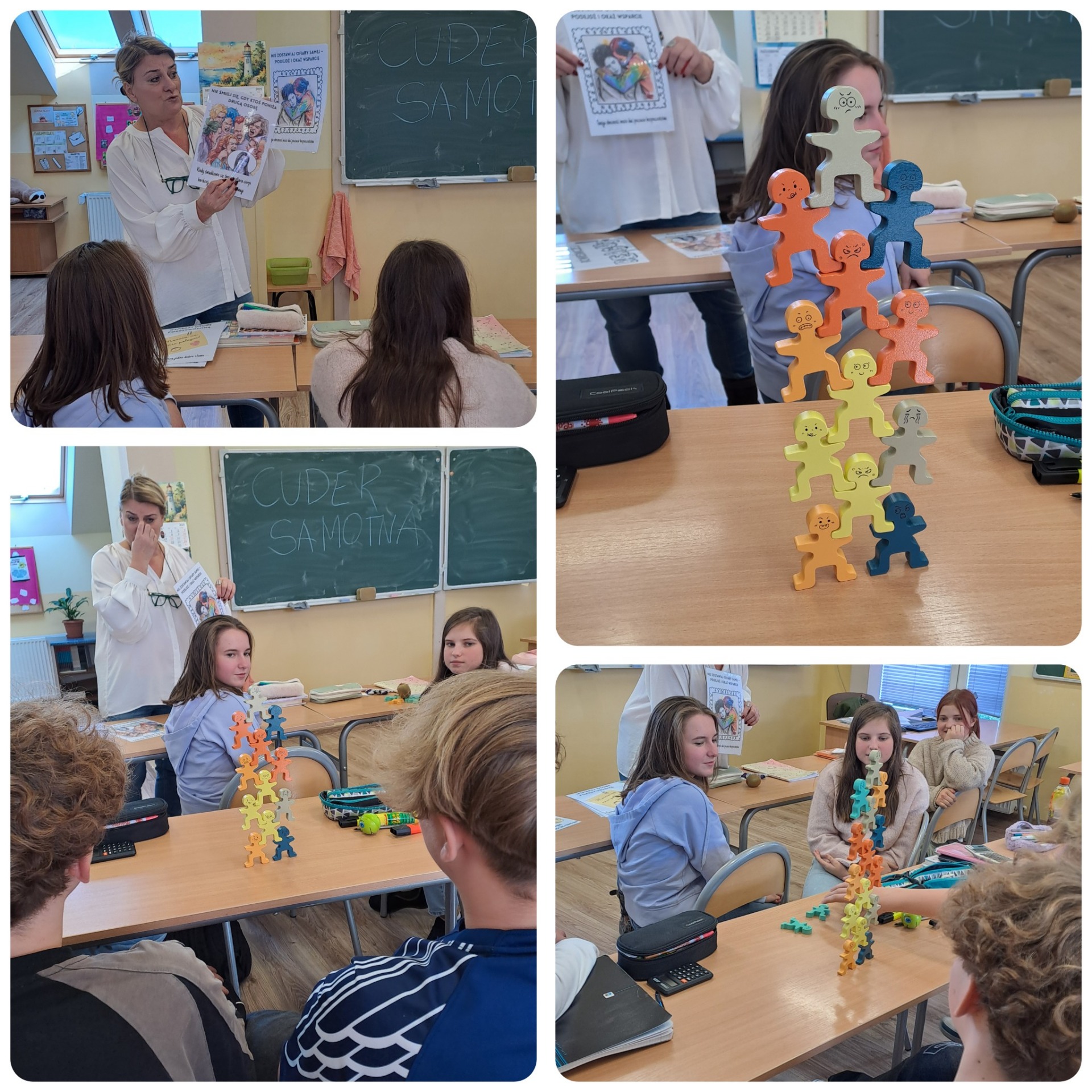 Podczas zajęć uczniowie analizowali konkretne sytuacje, pracowali na podstawie znanego im modelu CUDER. Za pomocą ćwiczeń z klockami uświadomili sobie jak ważna jest współpraca, umiejętność komunikacji i akceptacja. Warsztaty miały na celu budowanie empatii, odpowiedzialności i odwagi w przeciwstawianiu się agresji. Uczniowie dowiedzieli się również, gdzie szukać pomocy i jak wspierać osoby doświadczające przemocy.
