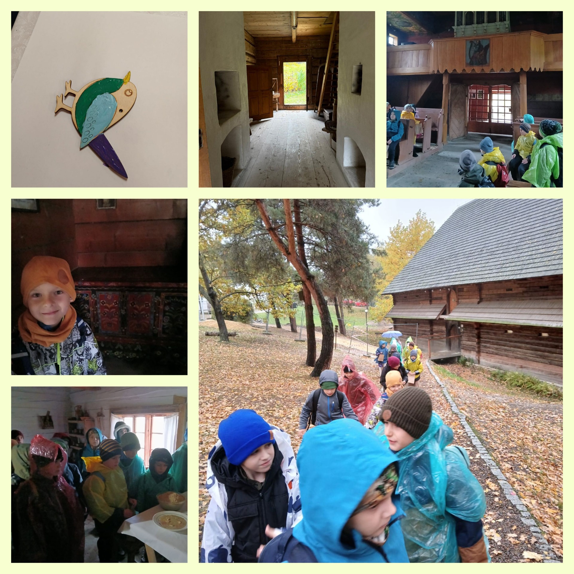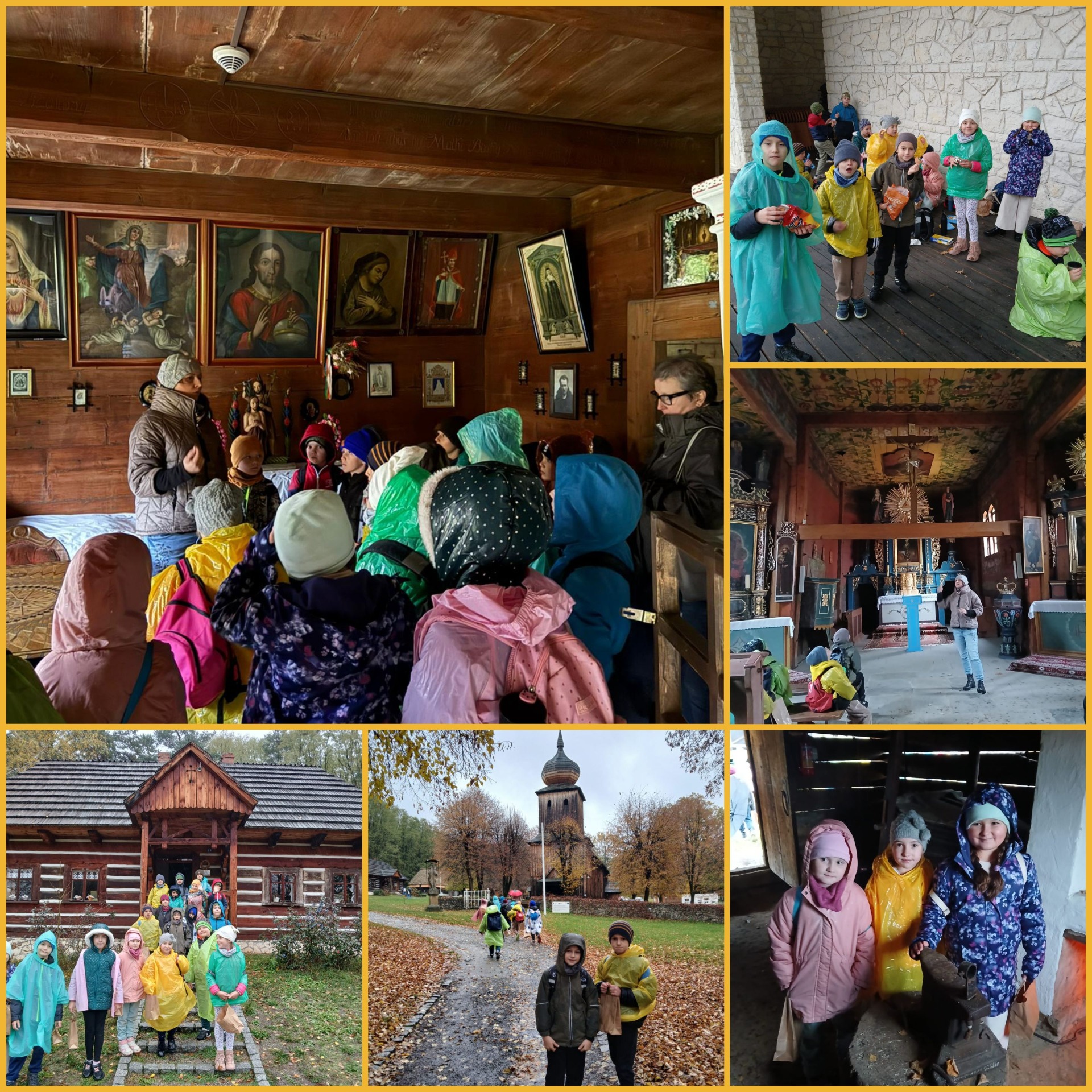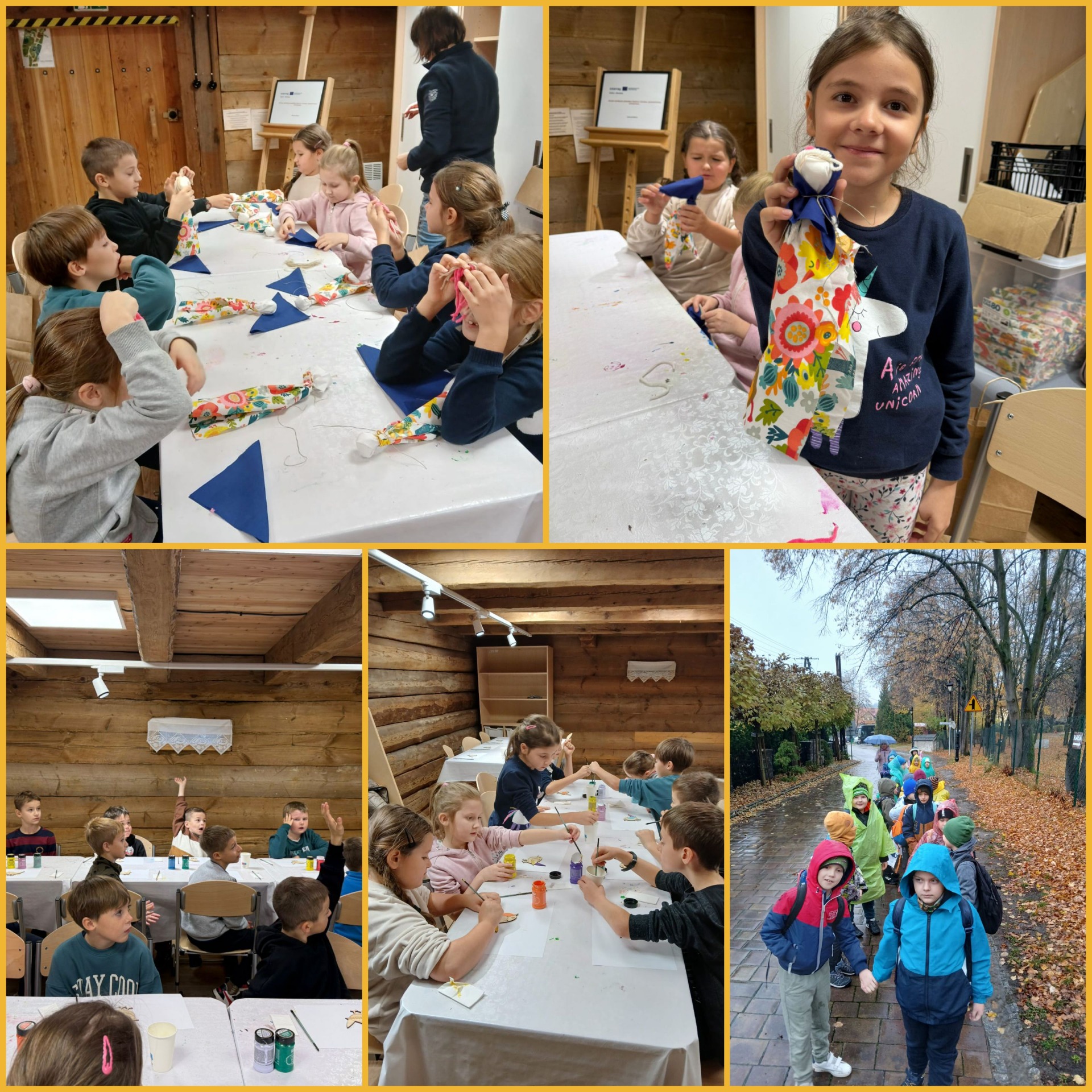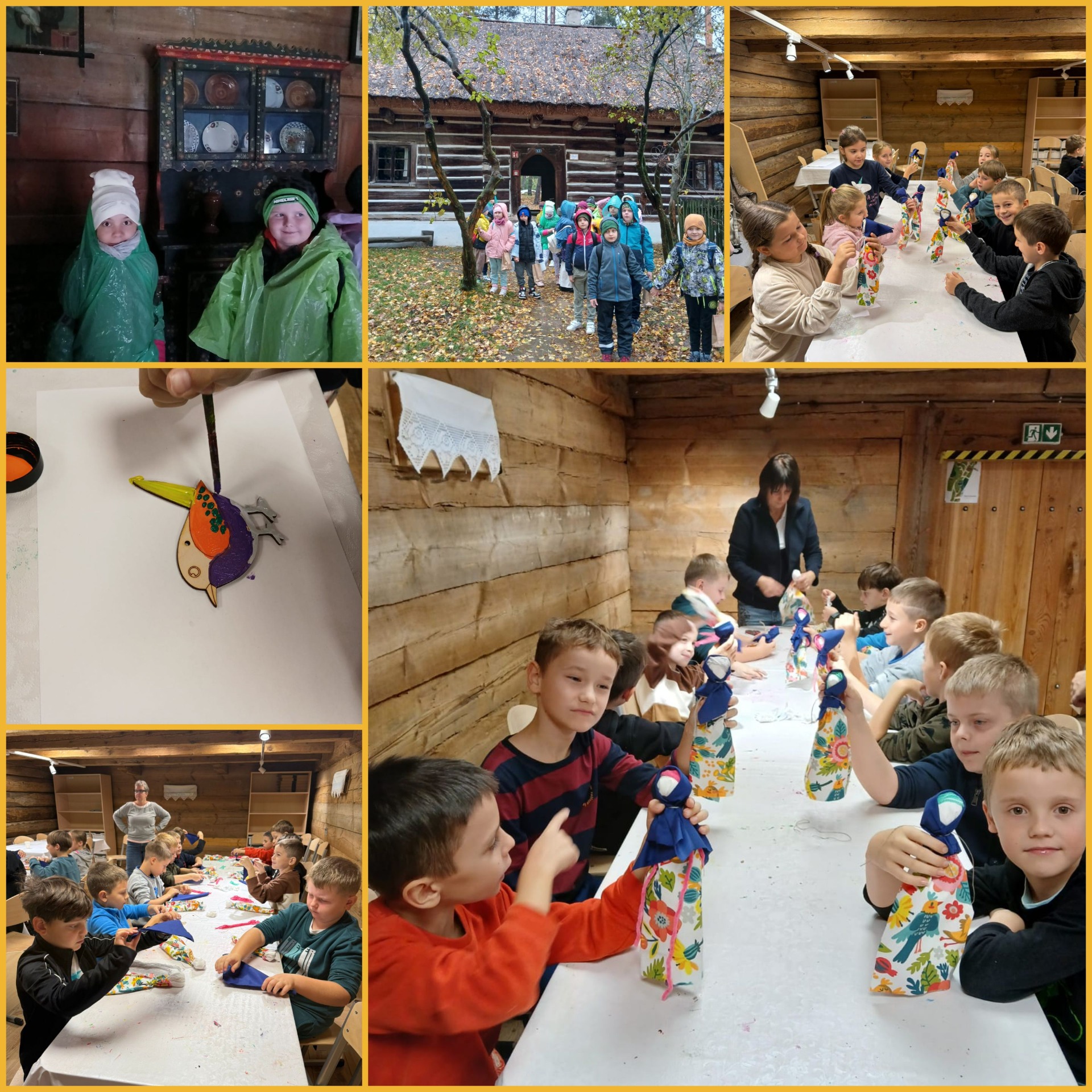w Wygiełzowie. Najpierw dzieci poznały zabawy i zabawki pradziadków, malowały drewniane ptaki i własnoręcznie zrobiły szmaciane lalki. Następnie odwiedziły chaty na terenie skansenu i te bogate, i te uboższe, kościół, młyn, kuźnię, straż pożarną, szkołę. Pomimo złej pogody uśmiech gościł na twarzach dzieci przez całą wycieczkę!