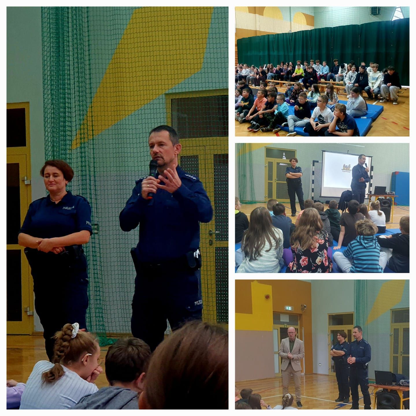 Podczas prelekcji, która miała miejsce na sali gimnastycznej, uczniowie klas IV–VIII wysłuchali z dużym zainteresowaniem informacji dotyczących bezpieczeństwa, odpowiedzialności karnej nieletnich oraz nowych zagrożeń, z jakimi mogą się spotkać młodzi ludzie – takich jak cyberprzemoc, uzależnienie od Internetu, gier sieciowych czy telefonów komórkowych.