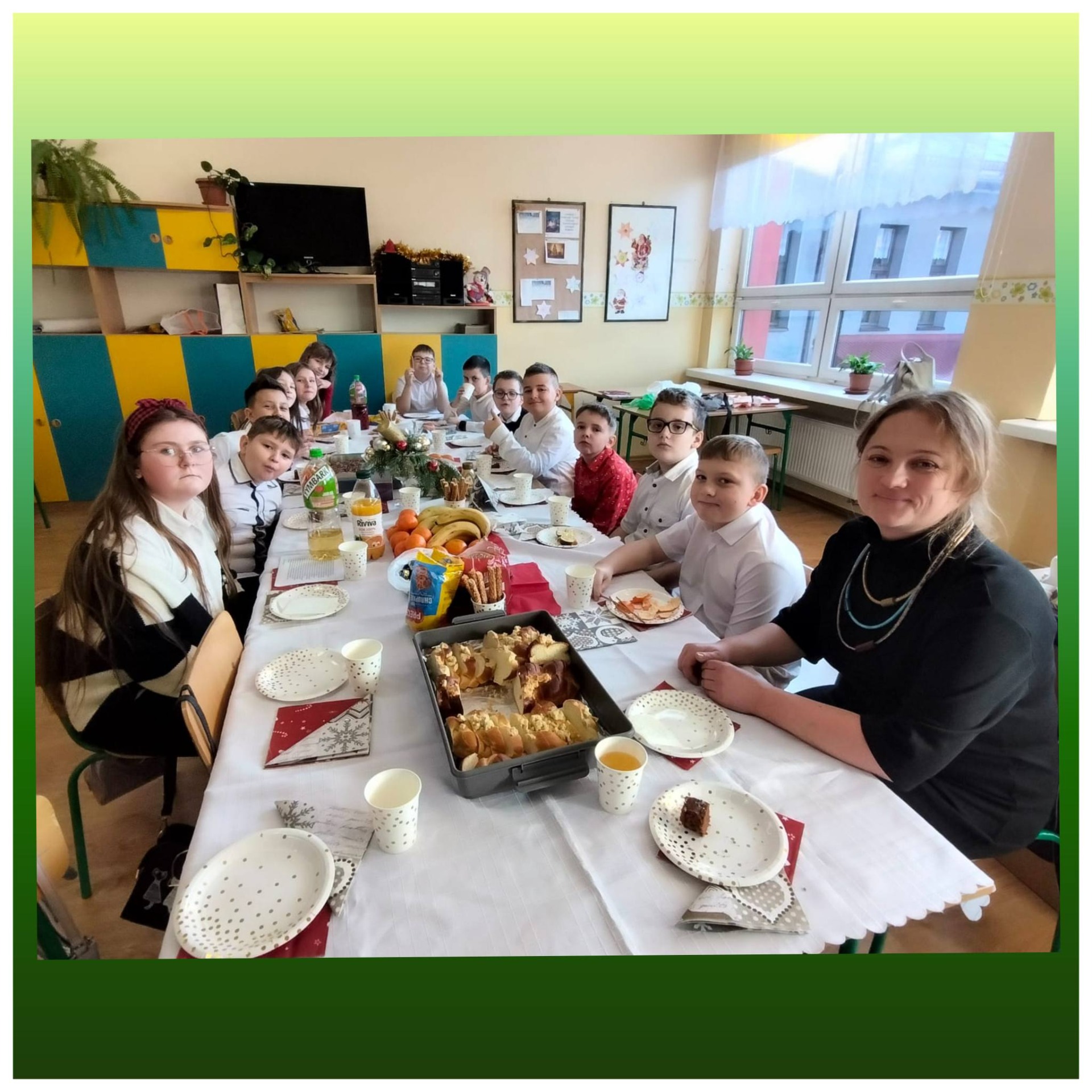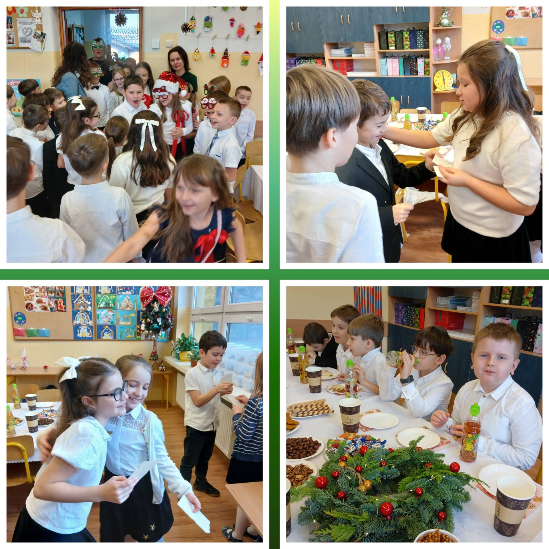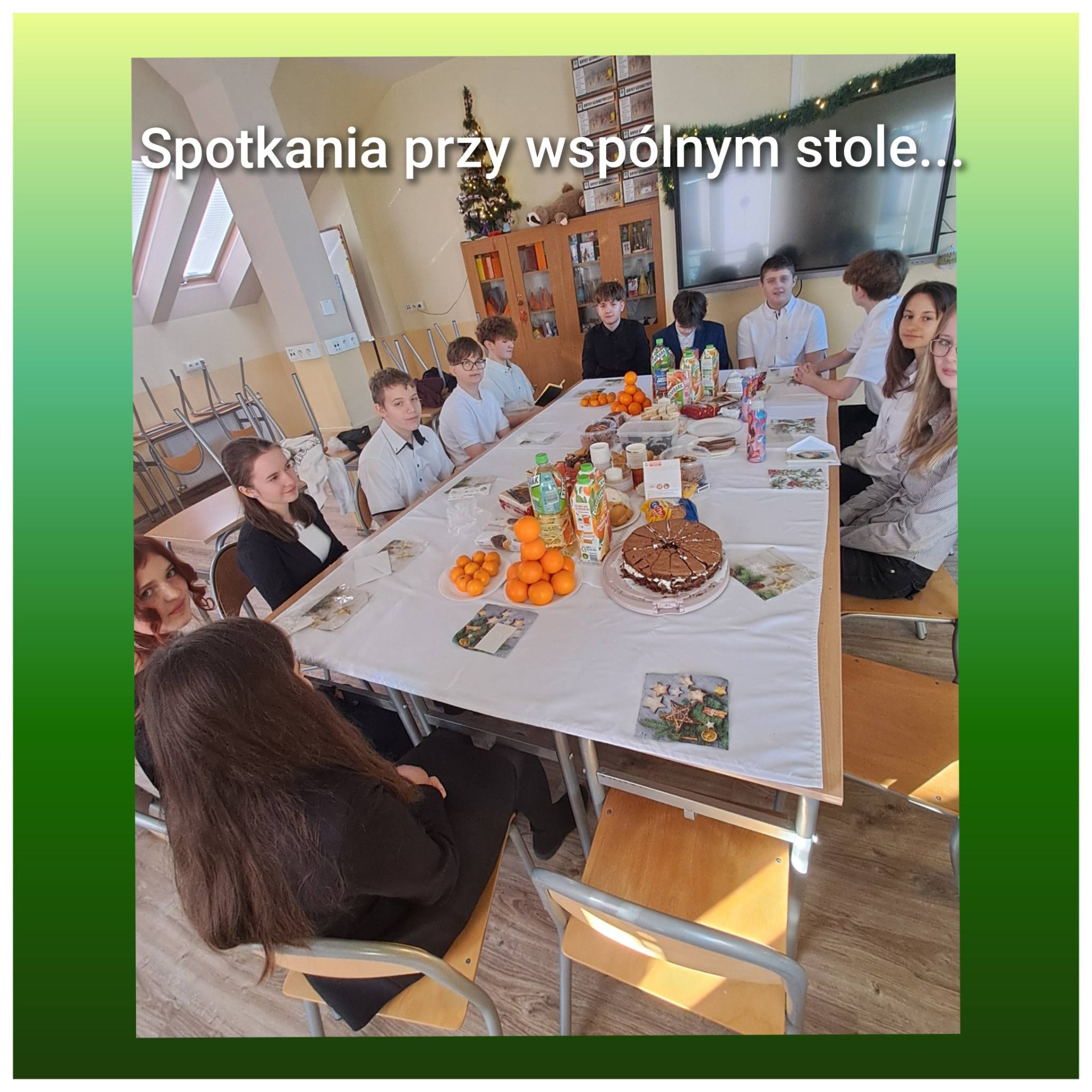 W piątek 19 grudnia, po apelu świątecznym, wszystkie klasy udały się na świąteczne klasowe spotkania. Zadbaliśmy o to, by tego dnia nikt nie został sam. Zaprosiliśmy do swoich klas panią pedagog oraz panią bibliotekarkę. Spotkanie przy wspólnym stole to niezwykły czas rozmów, uśmiechów, życzliwości, przebaczania, kolędowania. Tego dnia życzyliśmy sobie wszelkiego dobra!